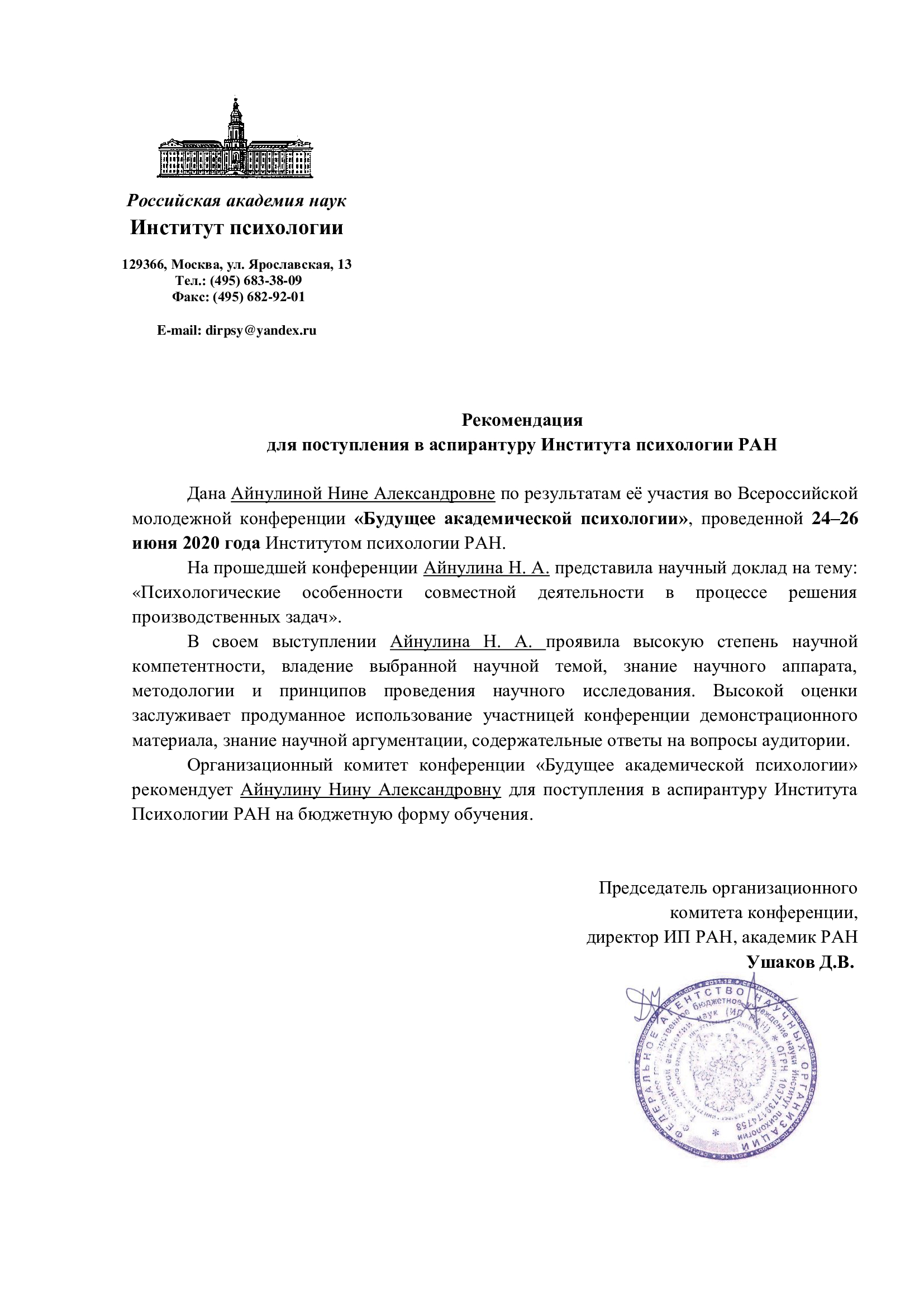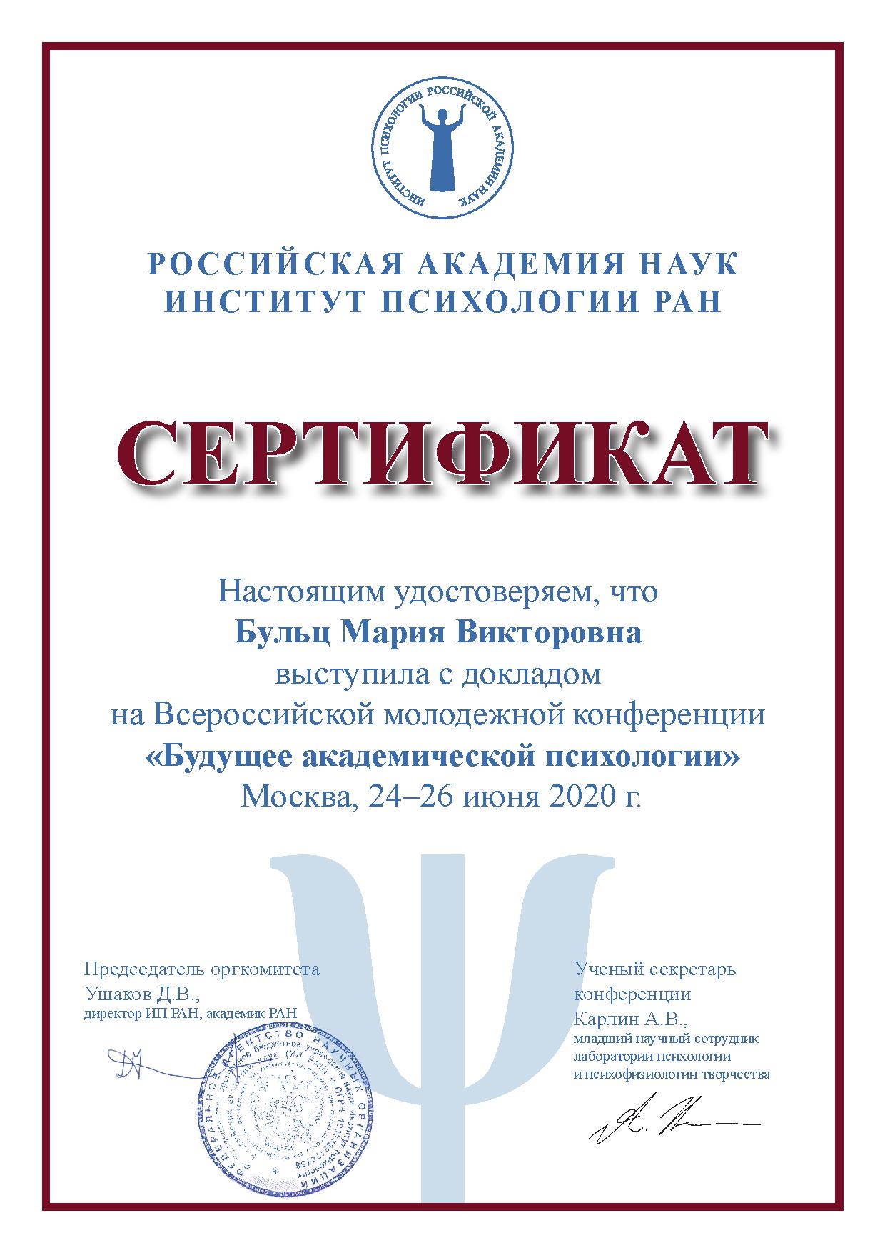 Институт психологии РАН 24-26 июня в рамках Всероссийской молодежной конференции «Будущее академической психологии» провёл II этап публичного обсуждения научно-исследовательских работ студентов выпускных курсов специалитетов, магистратуры и молодых учёных. На конкурс были представлены две исследовательские работы из Акмуллинского университета, выполненные под руководством декана факультета психологии, заведующего лабораторией Виктора Курунова в проблемном поле научно-исследовательской лаборатории психологии профессиональной деятельности и когнитивных исследований младшим научным сотрудником Ниной Айнулиной и студенткой 5 курса специалитета «Педагогика и психология девиантного поведения», стажёром-исследователем Марией Бульц. Обе работы успешно прошли этап независимых экспертных оценок и были допущены к публичным защитам. По результатам публичного обсуждения претенденты получили сертификаты участников и официальную рекомендацию для поступления на бюджетное место в аспирантуру Института психологии РАН в 2020 году, подписанную директором ИП РАН, академиком РАН Ушаковым Д.В., которая была высшей наградой для авторов лучших работ. Поздравляем Нину Айнулину, Марию Бульц и их научного руководителя с заслуженным признанием  и желаем им дальнейших успехов в научных поисках!