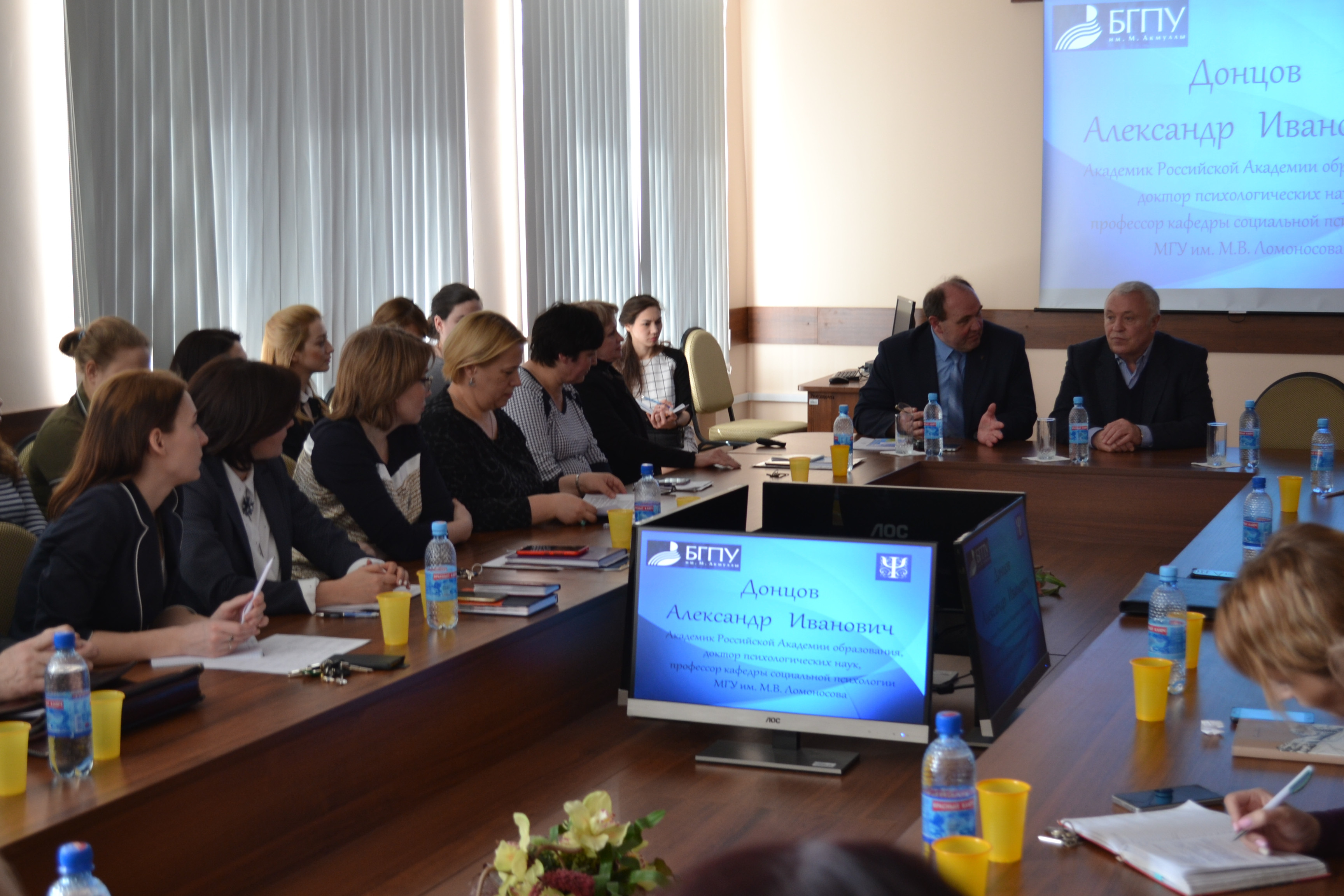 14 апреля в рамках Методологического семинара БГПУ им. М. Акмуллы "Апрельские окна" на факультете психологии состоялась работа тематической сессии "Актуальные проблемы развития психологической науки и практики", модераторами которой выступили действительный академик Российской академии образования, доктор психологических наук, профессор МГУ, председатель экспертной комиссии ВАК РФ Александр Иванович Донцов и декан факультета, доцент Виктор Валерьевич Курунов.