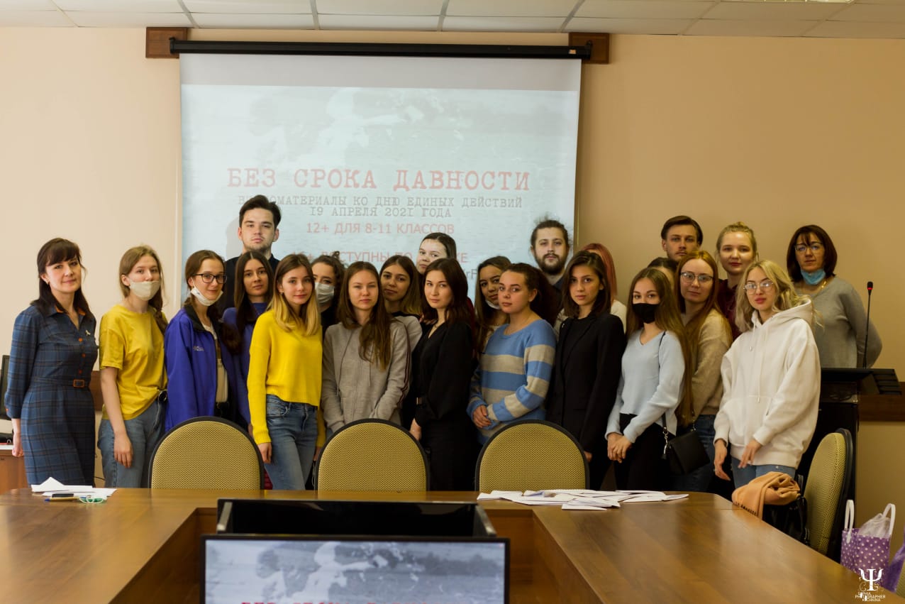 19 апреля 2021 года факультет психологии БГПУ им.М.Акмуллы принял участие во всероссийской акции «День единых действий», в память о геноциде советского народа нацистами и их пособниками в годы Великой Отечественной войны, с целью сохранить историческую правду, масштаб, и характер о преступлении нацистов и их пособников в отношении мирных советских граждан в годы Великой Отечественной войны на оккупированной территории, дать им правовую оценку с исторической и современной точки зрения, сформировать у студентов непримиримую позицию осуждения попыток героизации нацистов. Студентам напомнили, что действия Красной армии и единение советского народа в достижении Победы спасли наше государство и его граждан от полного уничтожения. В акции приняли участие студенты 2 и 4 курса специалитета и преподаватели. Был проведен открытый урок с просмотром видеофильма «Без срока давности», посвященный памяти жертв геноцида Советского народа от немецко-фашистских захватчиков в годы Великой Отечественной войны. Также студентами были написаны письма в будущее «Нельзя забыть»- послание самому себе и своим потомкам в форме треугольного (военного) письма, в котором они могли выразить личное восприятие и позиции о преступлениях нацистов в отношении мирного советского населения. В завершающей части урока памяти была проведена дискуссия о сохранении исторической правды. Студенты активно и искренне отвечали на вопросы, и делились мнениями о том, какие чувства они испытали, увидев кадры преступления нацистов и пособников против мирного населения. Студенты пришли к полному пониманию, что необходимо сохранить и знать историческую правду о преступлениях нацистов в отношении мирного советского населения в годы Великой Отечественной войны и сохранить память на века. Никогда не забывать историю своей страны! Помнить о героях! Заместитель декана по социально-воспитательной работе Альбина Маратовна Валишина