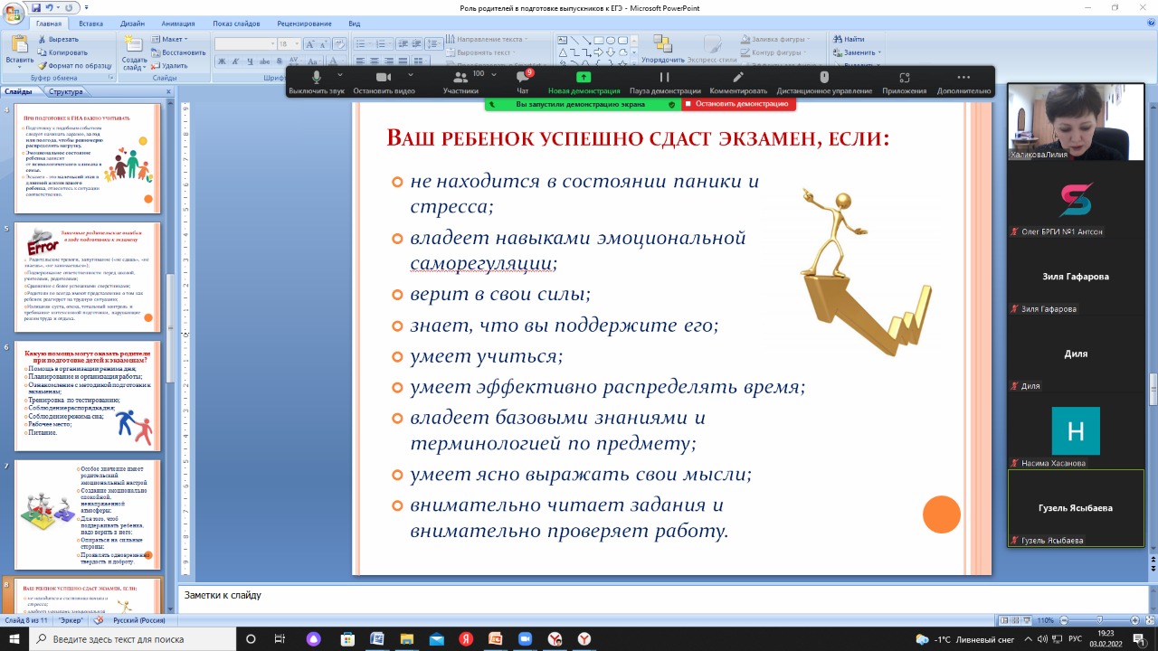 В рамках национального проекта «Образование» по оказанию бесплатных услуг психолого-педагогической, методической и консультационной помощи родителям (законным представителям) детей по запросу родителей Башкирской республиканской гимназии-интерната №1 им. Р. Гарипова 3 февраля в 19.00 ч. на факультете психологии состоялось обучающее мероприятие с применением информационно-телекоммуникационных технологий на тему «Роль родителей в подготовке детей к ГИА». Вебинар проводила Лилия Рашитовна Халикова, к.п.н., доцент кафедры общей и педагогической психологии БГПУ им. М. Акмуллы. На мероприятии приняли участие более 100 родителей обучающихся 11 классов данной гимназии. Были проанализированы факторы экзаменационного стресса, типичные родительские ошибки в ходе подготовки к экзамену детей. Родители получили конкретные рекомендации по вопросу: "Какую помощь могут оказать родители при подготовке детей к экзаменам?". В конце вебинара родители задавали вопросы на интересующие темы.