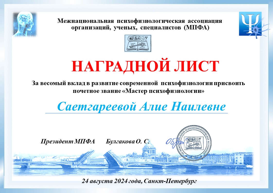 На II-ом Форуме психофизиологов почетным знаком «Мастер психофизиологии» была награждена Саетгареева Алия Наилевна, магистрант 2 курса направления «Клиническая психология» БГПУ им. М. Акмуллы (научный руководитель - профессор Эльвира Шаяхметова).