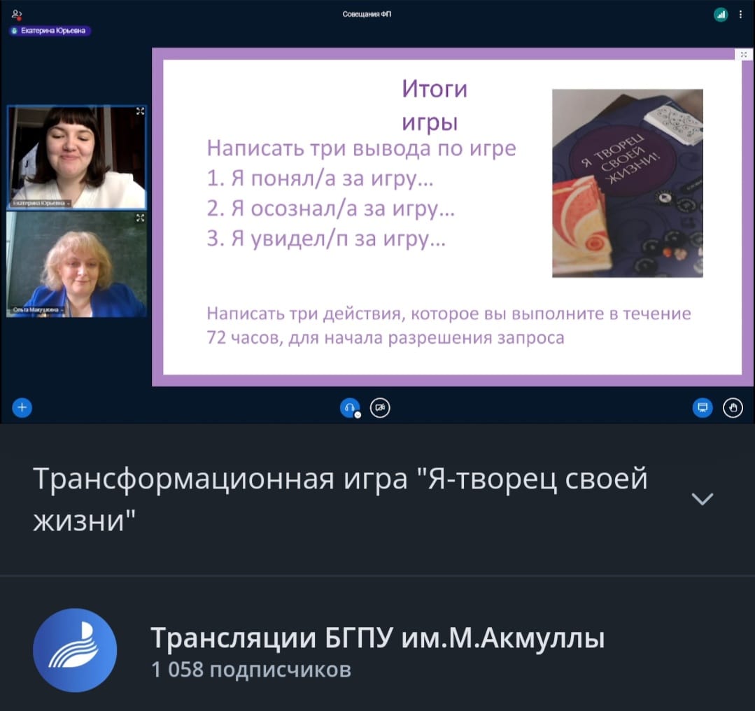 Выступая с докладом «Роль трансформационных игр в социально-психологической практике» Ольга Макушкина подчеркнула важность новой эффективной формы социально-психологической практики, которая требует более глубокого изучения и внедрение в образовательные программы подготовки психологов.  А также рассказала об опыте на факультета психологии изучения трансформационных психологических игр в рамках учебной технологической практики (игровые технологии) при подготовки бакалавров по направлению 44.03.01- Психолого-педагогическое образование по профилю «Индивидуальное психологическое консультирование и медиация в социальной сфере». Благодаря этому опыту студентами факультета создан Клуб Трансформационных Игр, где студенты старших курсов проводят встречи на различные темы, используя т-игру как инструмент. На конференции для участников магистрант 1 курса Екатерина Макушкиной провела в онлайн - формате мастер-класс трансформационная игра «Я творец своей жизни».