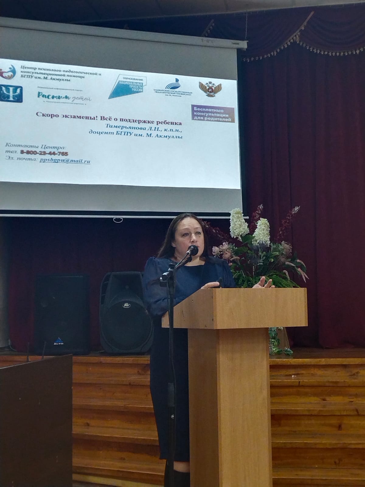 Заведующий кафедрой общей и педагогической психологии Лилия Тимерьянова приняла участие в районном родительском собрании в Орджоникидзевском районе г.Уфы. Тема выступления "Оказание психологической помощи ребенку в период сдачи экзаменов". Родителям были предложены рекомендации по поддержке ребенка в этот ответственный период. Сделан был акцент на том, что  психологическая поддержка - это процесс в котором взрослый сосредотачивается на позитивных сторонах и преимуществах ребенка . Родители проявили большую заинтересованность и смогли задать вопросы.