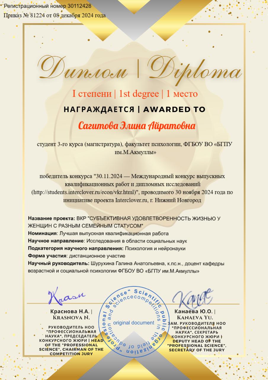 Магистрантка 3 курса по профилю "Семейная психология" Сагитова Элина Айратовна представила на Международный конкурс выпускных квалификационных работ и дипломных исследований свою работу "Субъективная удовлетворенность жизнью у женщин с разным семейным статусом" и заняла I место. Научным руководителем Элины Сагитовой является кандидат психологических наук, доцент кафедры возрастной и социальной психологии Галина Анатольевна Шурухина.