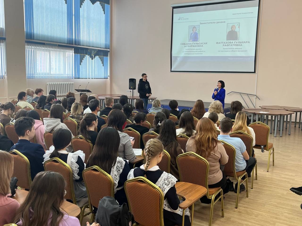 Заведующая кафедрой общей и педагогической психологии Лилия Тимерьянова, доцент Гульсасак Сибаева Г.М. и.о. заведующего кафедрой возрастной и социальной психологии Ольга Макушкина познакомили собравшихся с программами, реализуемыми на факультете.