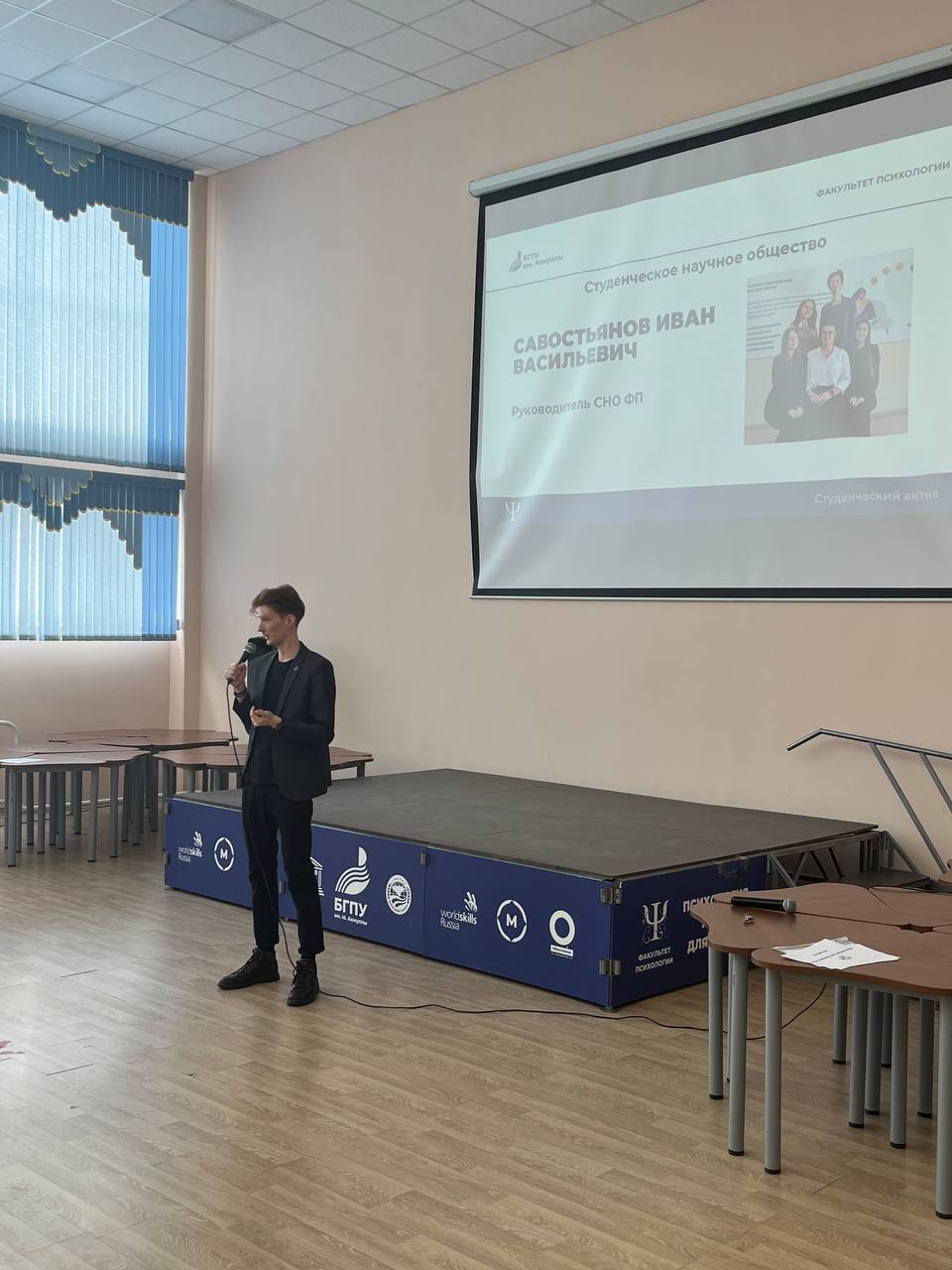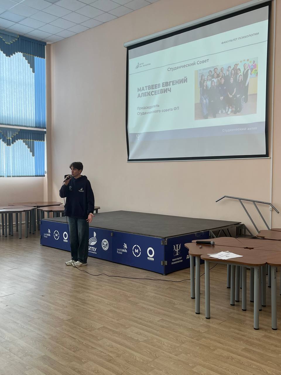 Ведущий мероприятия, активист факультета, студент четвертого курса Павел Рудявко открыл официальную часть Дня открытых дверей своими воспоминаниями о том, как он с девятого класса осознанно готовился к поступлению на факультет психологии и поделился с собравшимися своими планами реализации полученных знаний в своей дальнейшей профессиональной деятельности.