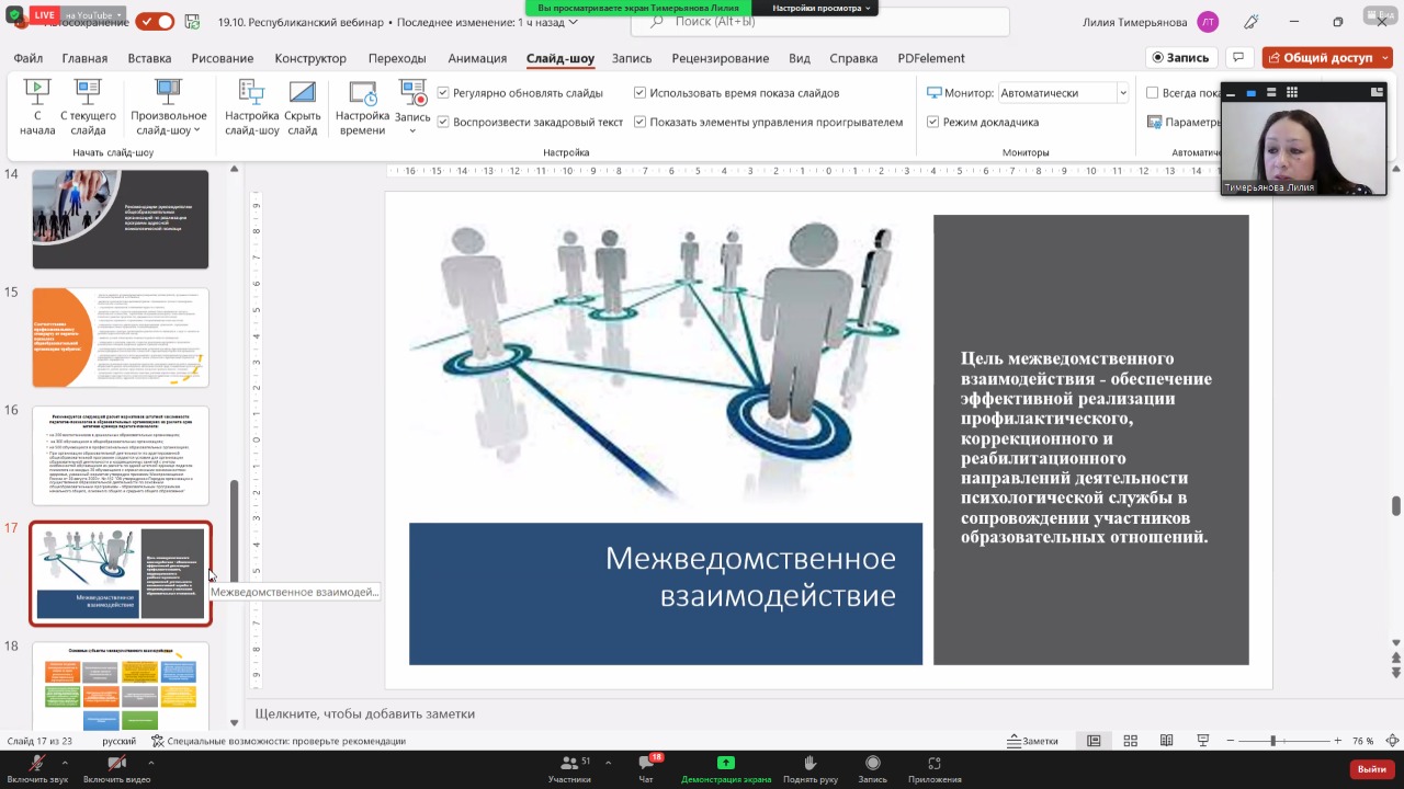 В рамках "Недели психологии"  19 октября  2022 г.  на Факультете психологии состоялся республиканский научно-методический вебинар «Особенности деятельности психологических служб в общеобразовательных организациях на современном этапе». Спикером выступила и.о. заведующего кафедрой общей и педагогической психологии БГПУ им. М. Акмуллы Тимерьянова Лилия Николаевна. В мероприятии приняли участие  педагоги-психологи образовательных организаций и студенты, обучающиеся по психологическим направлениям. Были рассмотрены нормативные документы, регламентирующие деятельность  психологических служб образования. Определены целевые группы и специфика программ оказания им адресной психологической помощи. Рассмотрены особенности межведомственного взаимодействия  психологических служб с субъектами профилактики. Было представлено методическое сопровождение деятельности психологических служб образования. У участников была возможность задать вопросы. Участники выразили благодарность спикеру.