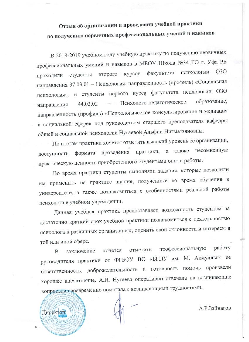 Организация и проведение практики высоко оценены директором МБОУ СОШ № 34 ГО г. Уфа А.Р. Зайнаговым, пригласившим факультет психологии к дальнейшему плодотворному творческому сотрудничеству.