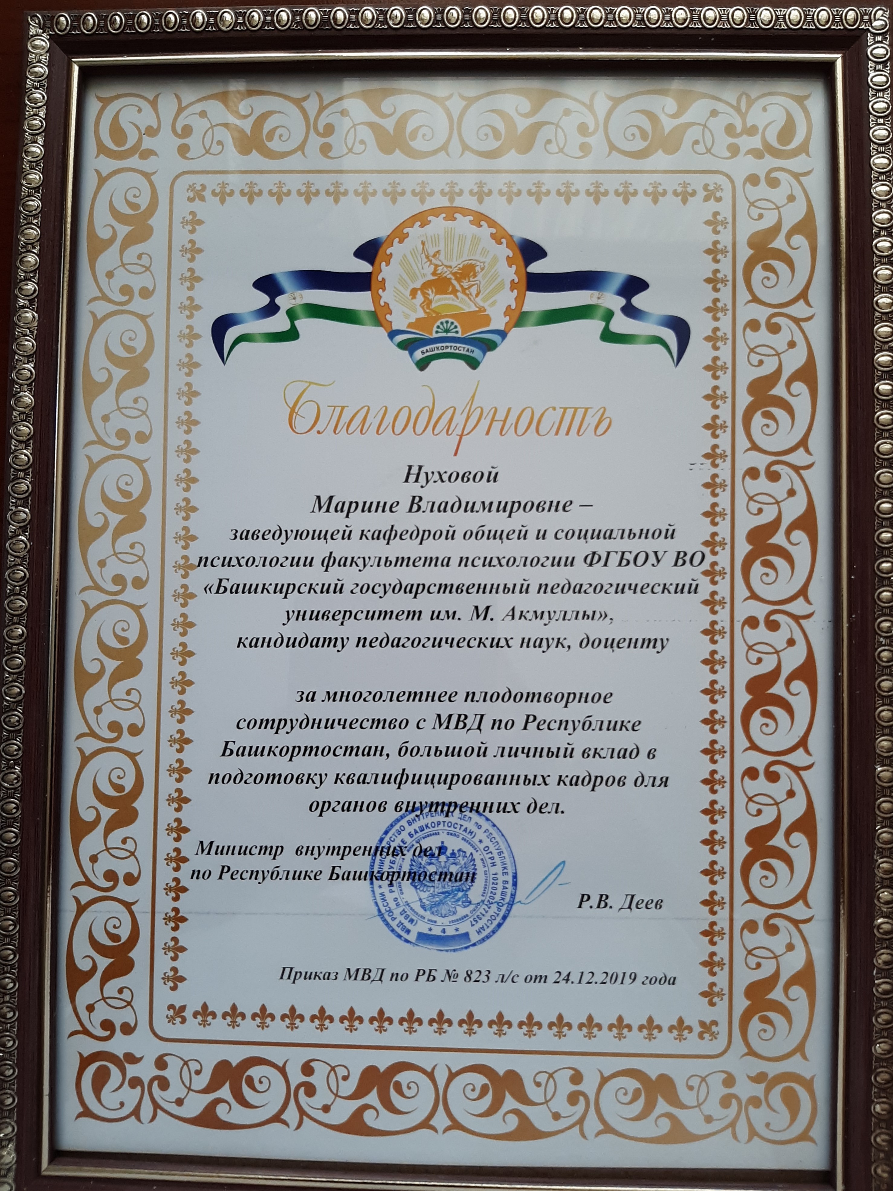 Приказом Министерства внутренних дел по Республике Башкортостан № 823 л/с от 24.12. 2019 года зав.кафедрой общей и социальной доценту Марине Владимировне Нуховой и профессору кафедры Эльвире Шигабетдиновне Шаяхметовой была объявлена благодарность за многолетнее плодотворное сотрудничество С МВД по Республике Башкортостан, большой личный вклад в подготовку квалифицированных кадров для органов внутренних дел. Торжественное вручение благодарственных писем ректором БГПУ им. М. Акмуллы С.Т. Сагитовым состоялось на заседании Ученого совета университета 27 февраля 2020 года. Поздравляем коллег с заслуженной наградой!!!