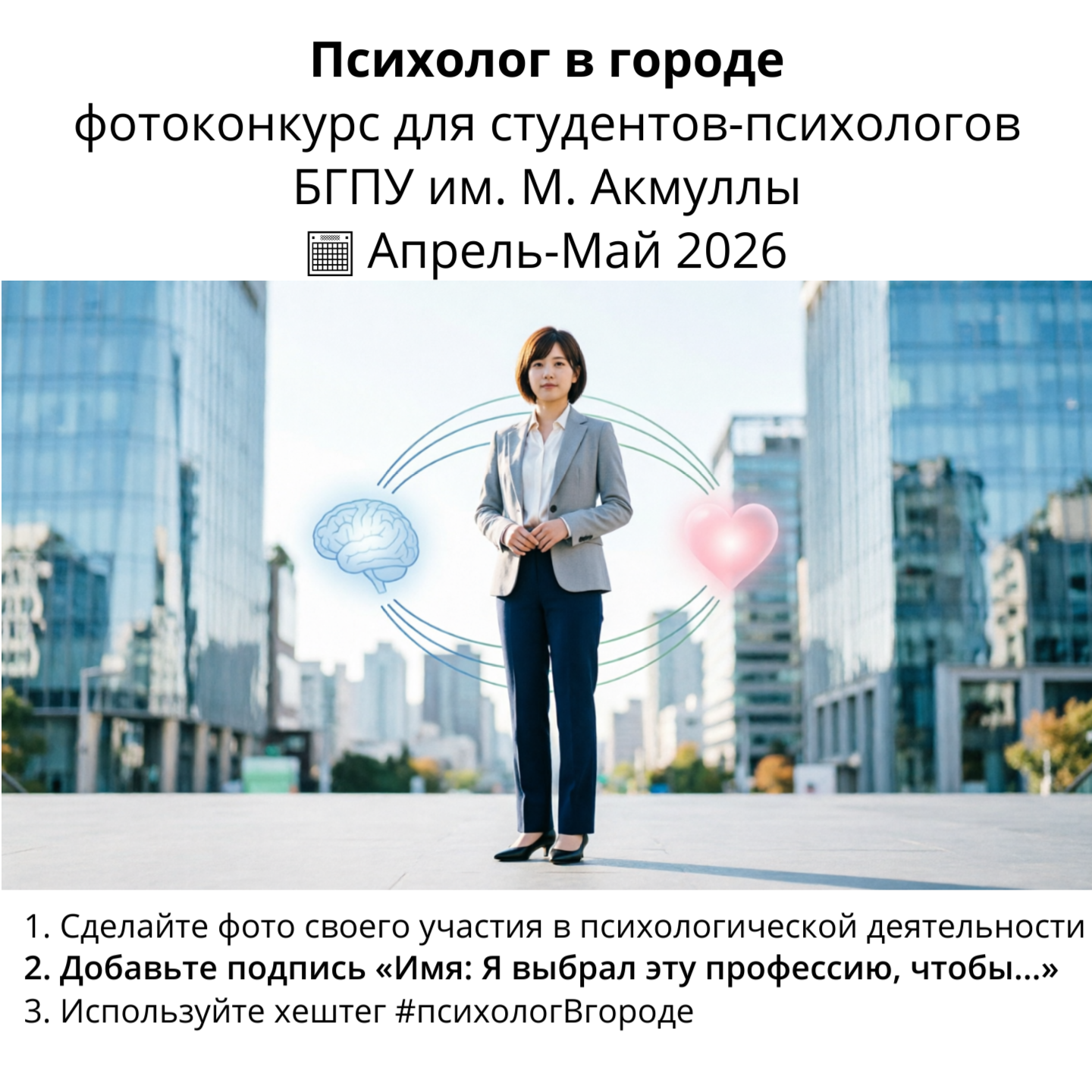 Уважаемые студенты факультета психологии БГПУ им. М. Акмуллы! Приглашаем вас принять участие в фотоконкурсе «Психолог в городе», который состоится в апреле-мае 2026 года.