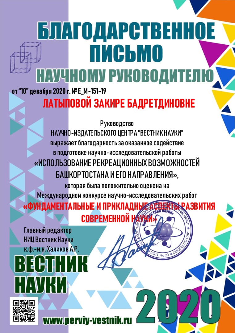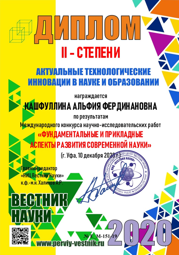 Ее работа «Использование рекреационных возможностей Башкортостана и его направления»  удостоена Диплома 2 степени «Актуальные технологические инновации в науке и образовании».