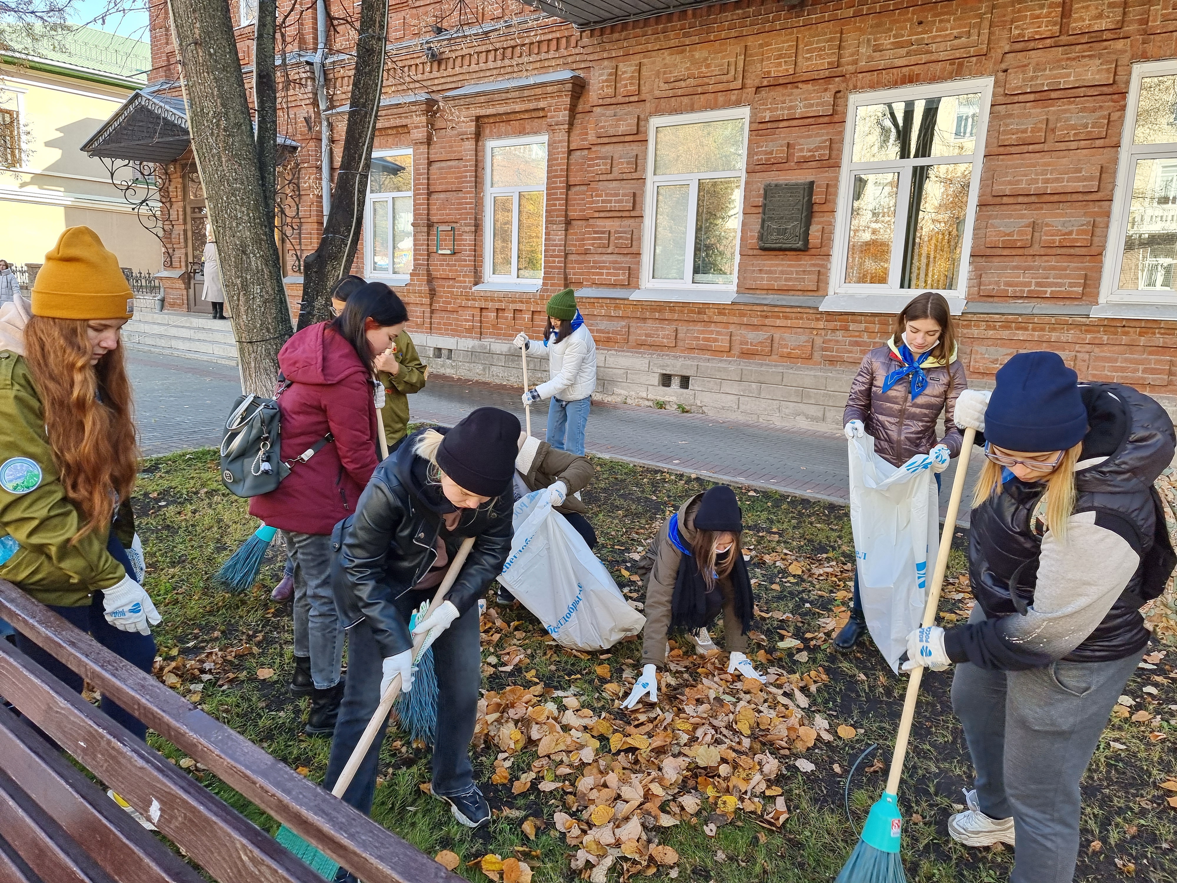 Вооружившись хозяйственными инструментами, мешками и перчатками студенты убрали листву с тротуаров и газонов аллеи.
