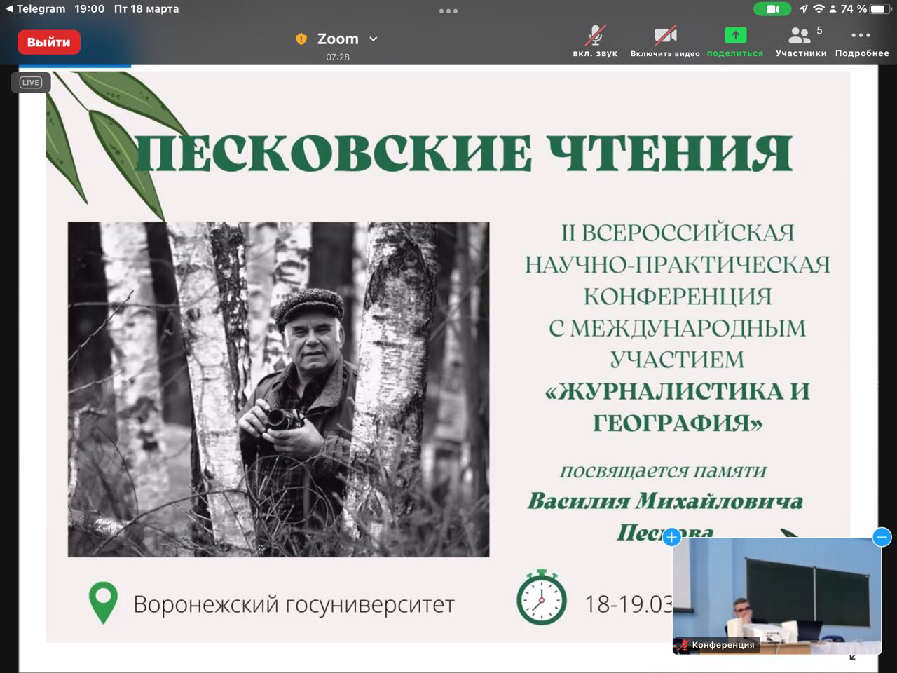Преподаватели и студенты кафедры экологии, географии и природопользования приняли участие в работе II научно-практической конференции Воронежского государственного университета на базе Факультета журналистики, факультета географии, геоэкологии и туризма, а также Воронежского государственного природного биосферного заповедника им. В. М. Пескова. Конференция состоялась 18 марта 2022 г. в рамках традиционных Песковских чтений и посвящена памяти Василия Михайловича Пескова.