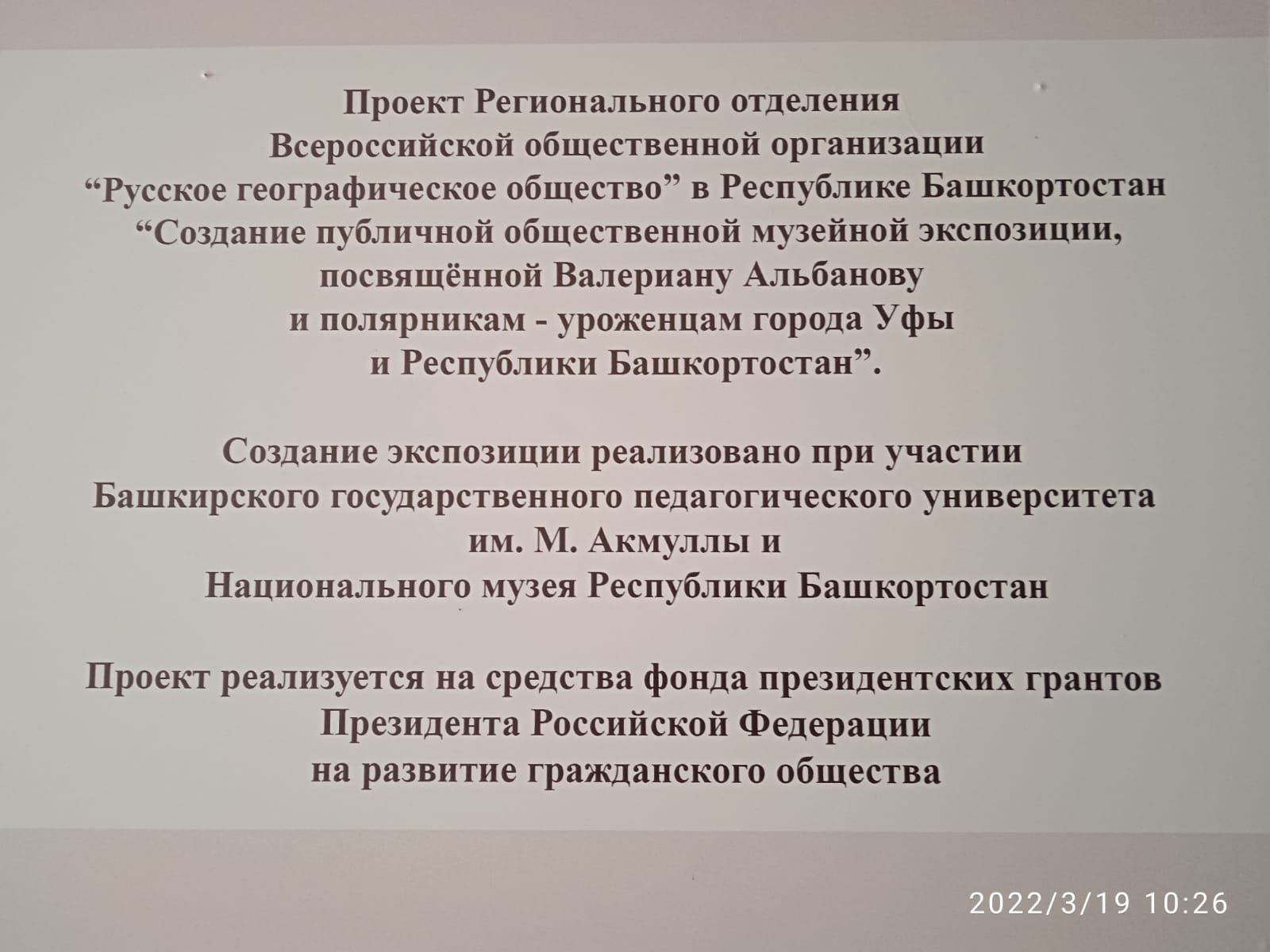 Данная экспозиция создана при участии БГПУ им.М.Акмуллы и Национального музея Республики Башкортостан в формате проекта регионального отделения Русского географического общества в Республике Башкортостан, реализованного на средства фонда президентских грантов.