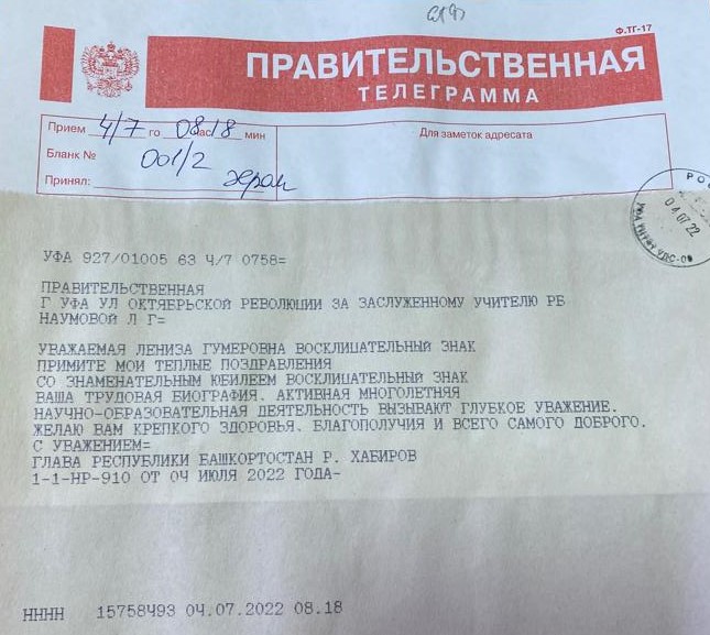 "Уважаемая Лениза Гумеровна! Примите мои теплые поздравления со знаменательным Юбилеем! Ваша трудовая биография, активная многолетняя научно-образовательная деятельность вызывает глубокое уважение. Желаю Вам крепкого здоровья, благополучия и всего самого доброго. С уважением, Глава Республики Башкортостан Р.Хабиров".