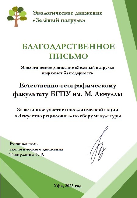 Выражаем благодарность студентам и преподавателям ЕГФ БГПУ им. М. Акмуллы, активистам МК РГО "ГеоЛог" за проявленную инициативу и гражданскую позицию! Координаторы проекта прислали благодарственное письмо - в электронном виде, чтобы не производить новый физический мусор. Спасибо! 75 кг макулатуры = 3/4 сохраненного дерева.