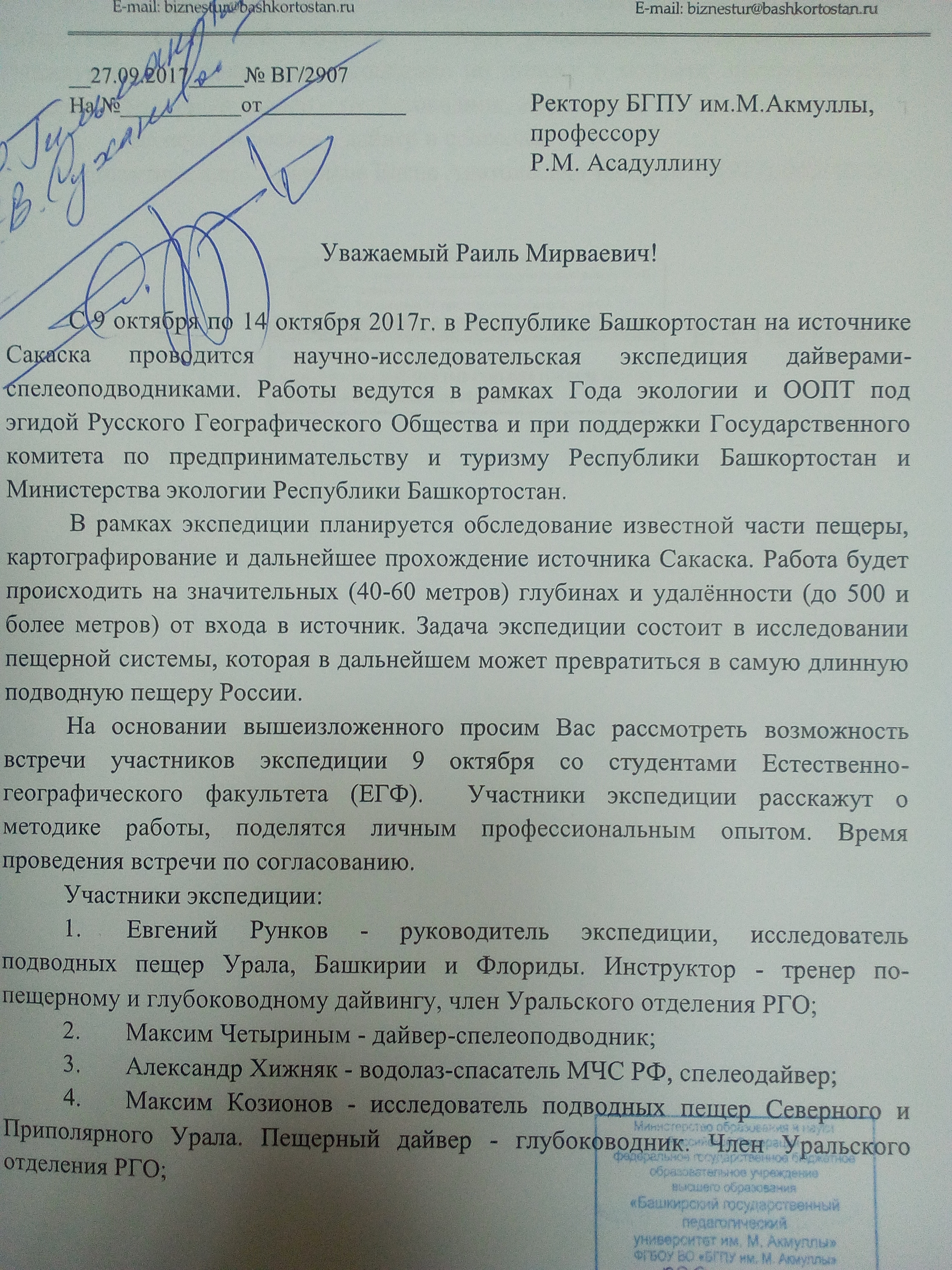 9 октября в читальном зале 2 корпуса БГПУ им. М. Акмуллы (начало в 12:20) состоится встреча с известными путешественниками, дайверами-спелеоподводниками, участниками научно-исследовательской экспедиции под эгидой Русского географического общества, Государственного комитета по предпринимательству и туризму РБ и Министерства экологии РБ. Участники экспедиции расскажут о методике работы, поделятся личным профессиональным опытом.