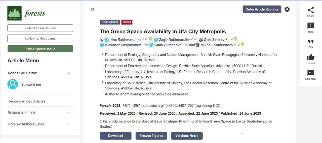 Ссылка на статью: Rakhmatullina I, Rakhmatullin Z, Zaitsev G, Davydychev A, Gilmanova G, Komissarov M. The Green Space Availability in Ufa City Metropolis. Forests. 2023; 14(7):1297. https://doi.org/10.3390/f14071297
