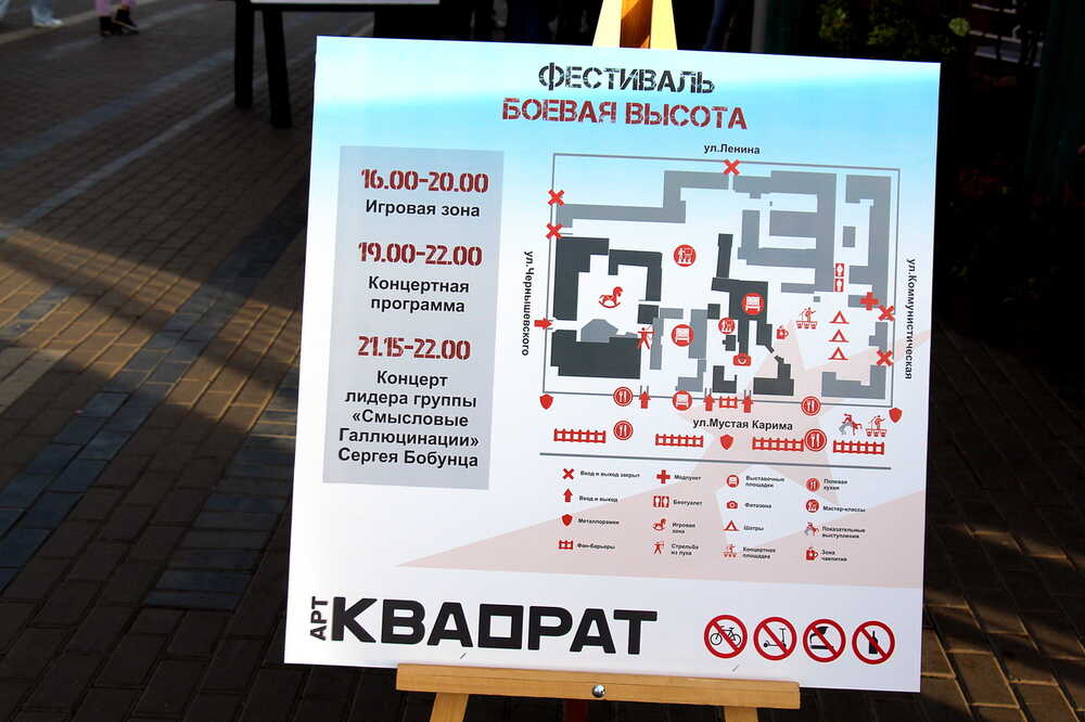 На территории площадок Арт-квадрата были развёрнуты многочисленные фотовыставки, посвященные героям Отечества — в исторической перспективе и героям Отечества наших дней, выставки ретро автомобилей и другой ретро техники, выставка интереснейших экспонатов музея поискового отряда им. Хатмуллы Султанова (Туймазинский район) и др.