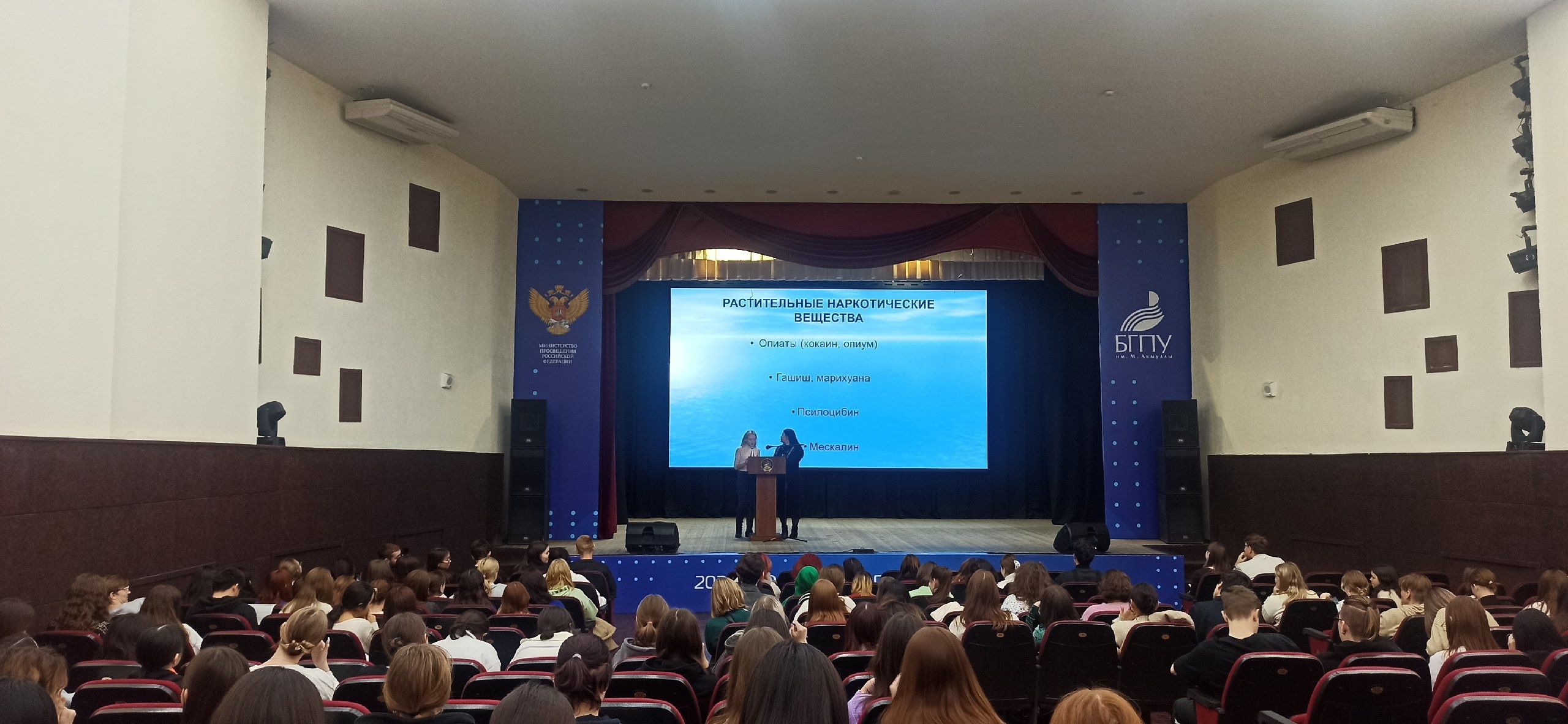 Студенты естественно-географического факультета посетили Концертный зал БГПУ, где с ними побеседовали психиатр-нарколог и медицинский психолог. Специалисты рассказали про психоактивные вещества, виды, признаки зависимой личности, профилактику употребления электронных сигарет, вейпов среди молодежи.