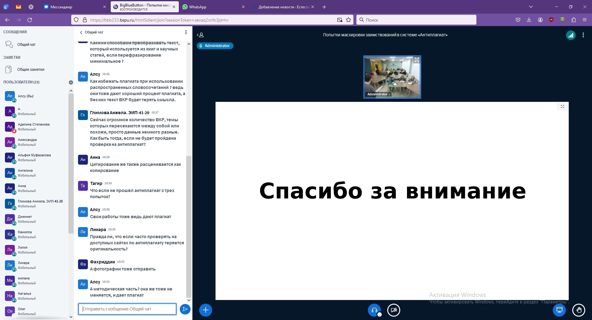 В рамках образовательной программы для студентов выпускного курса состоялась лекция на актуальную тему: " Антиплагиат: Попытки маскирования заимствований в системе "Антиплагиат". Опытный специалист в области оценки оригинальности текстов рассказал о способах обнаружения и предотвращения некорректных заимствований, а также о важности самостоятельного исследования и анализа информации при подготовке научных работ. На лекции были рассмотрены основные методы маскирования заимствований, такие как изменение формы слова, перестановки слов и использование синонимов и другие. Лекция вызвала большой интерес у студентов и способствовала повышению их осведомленности о важности самостоятельной работы над исследованиями.