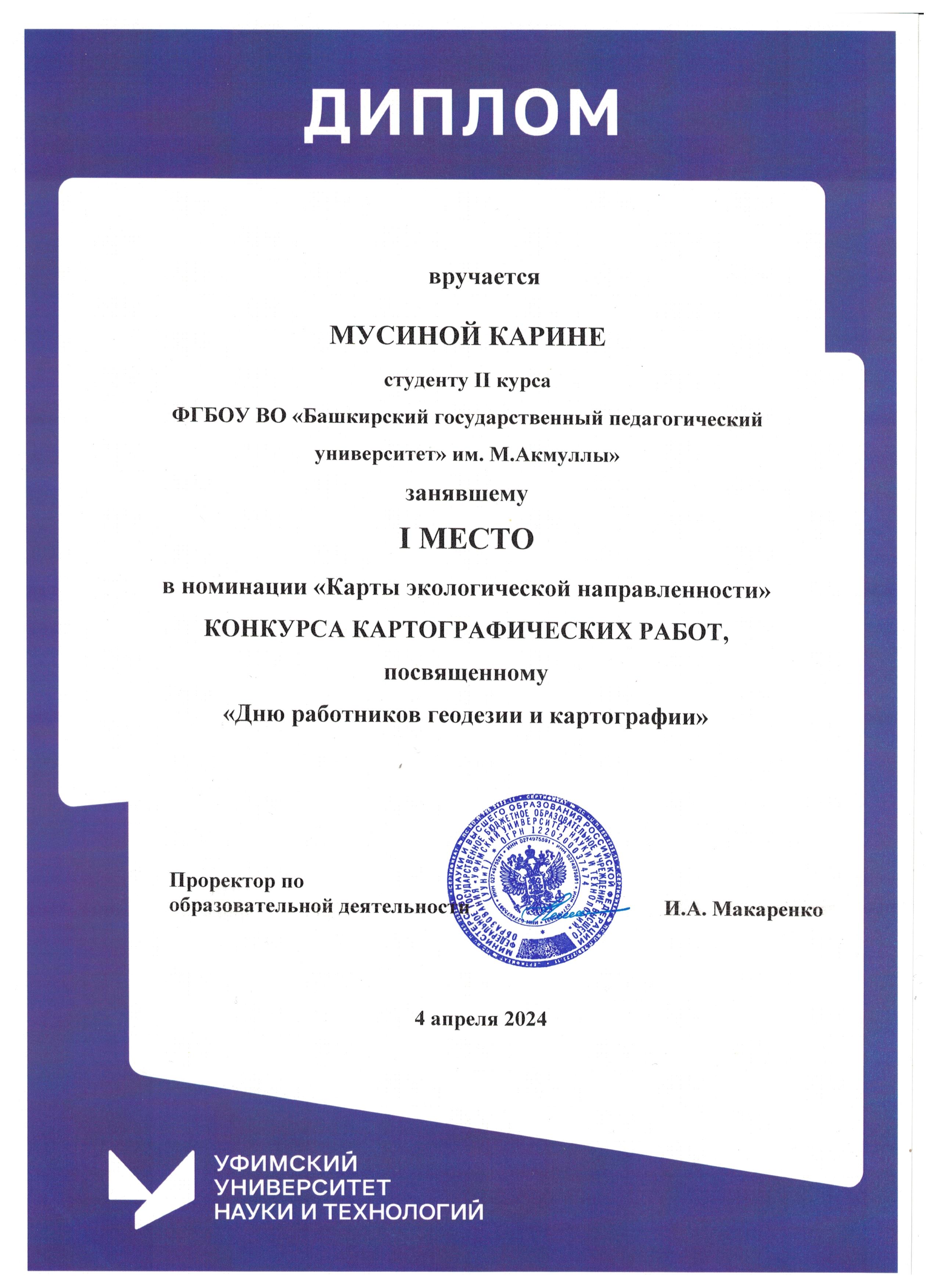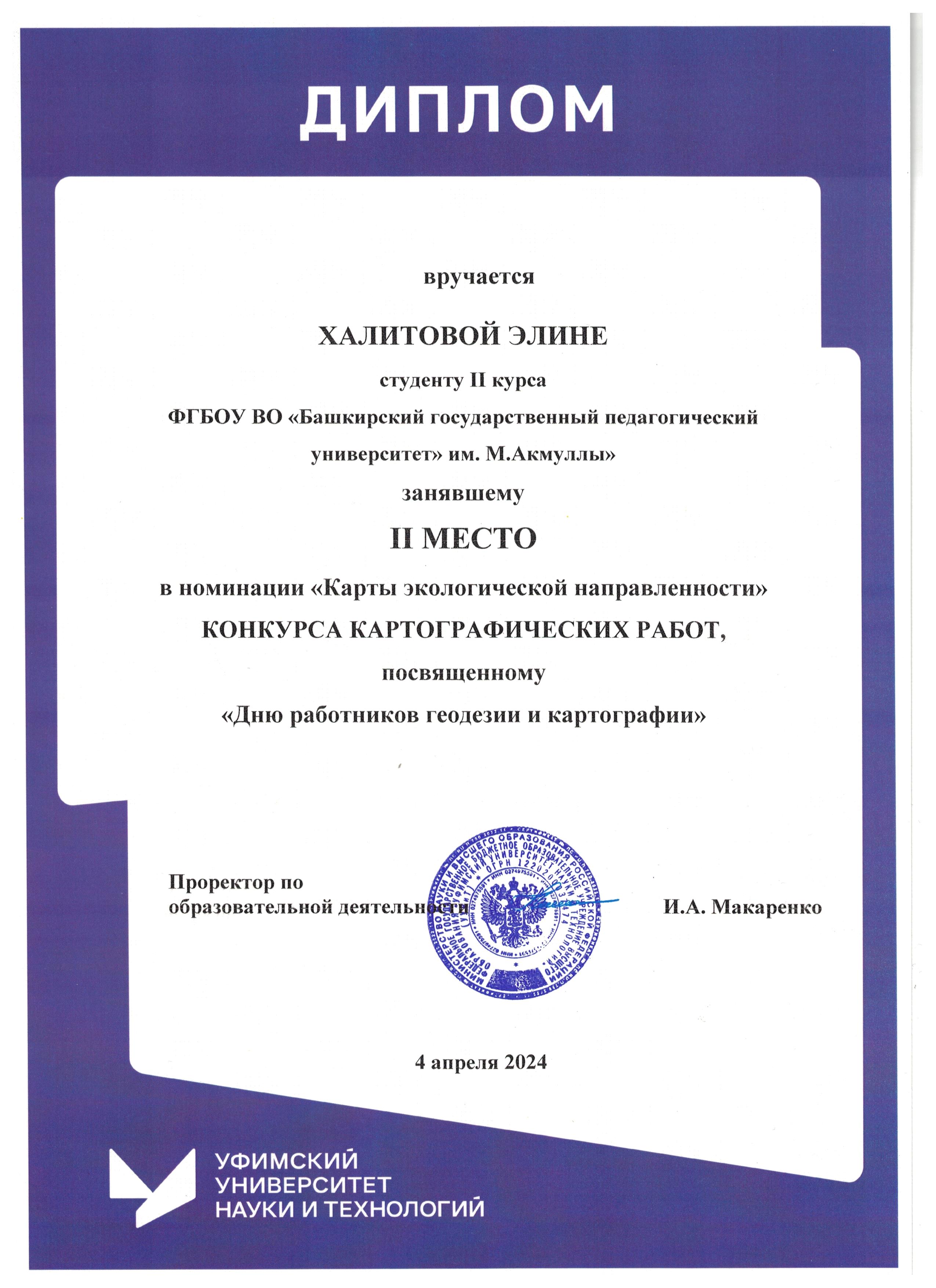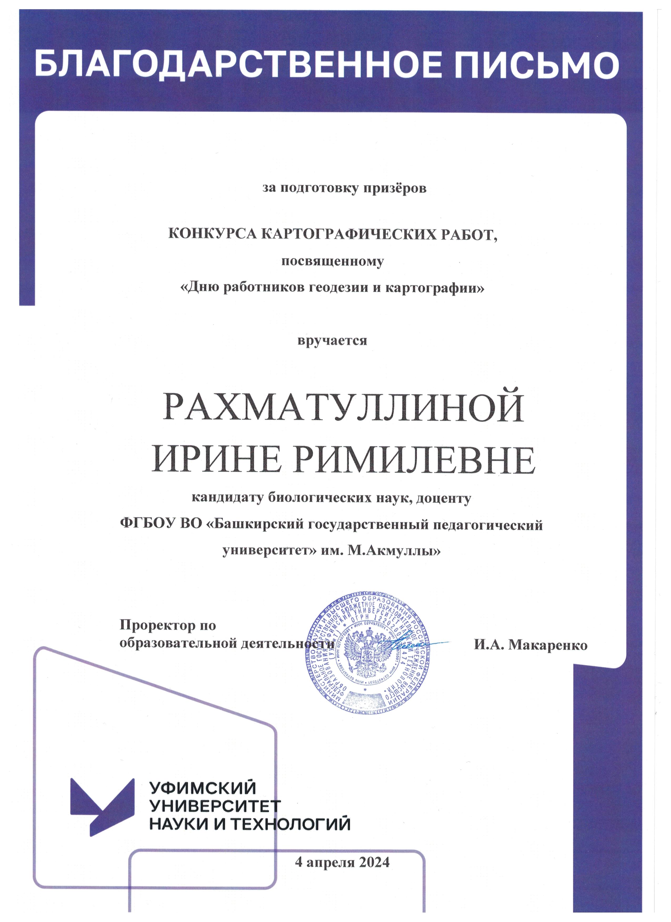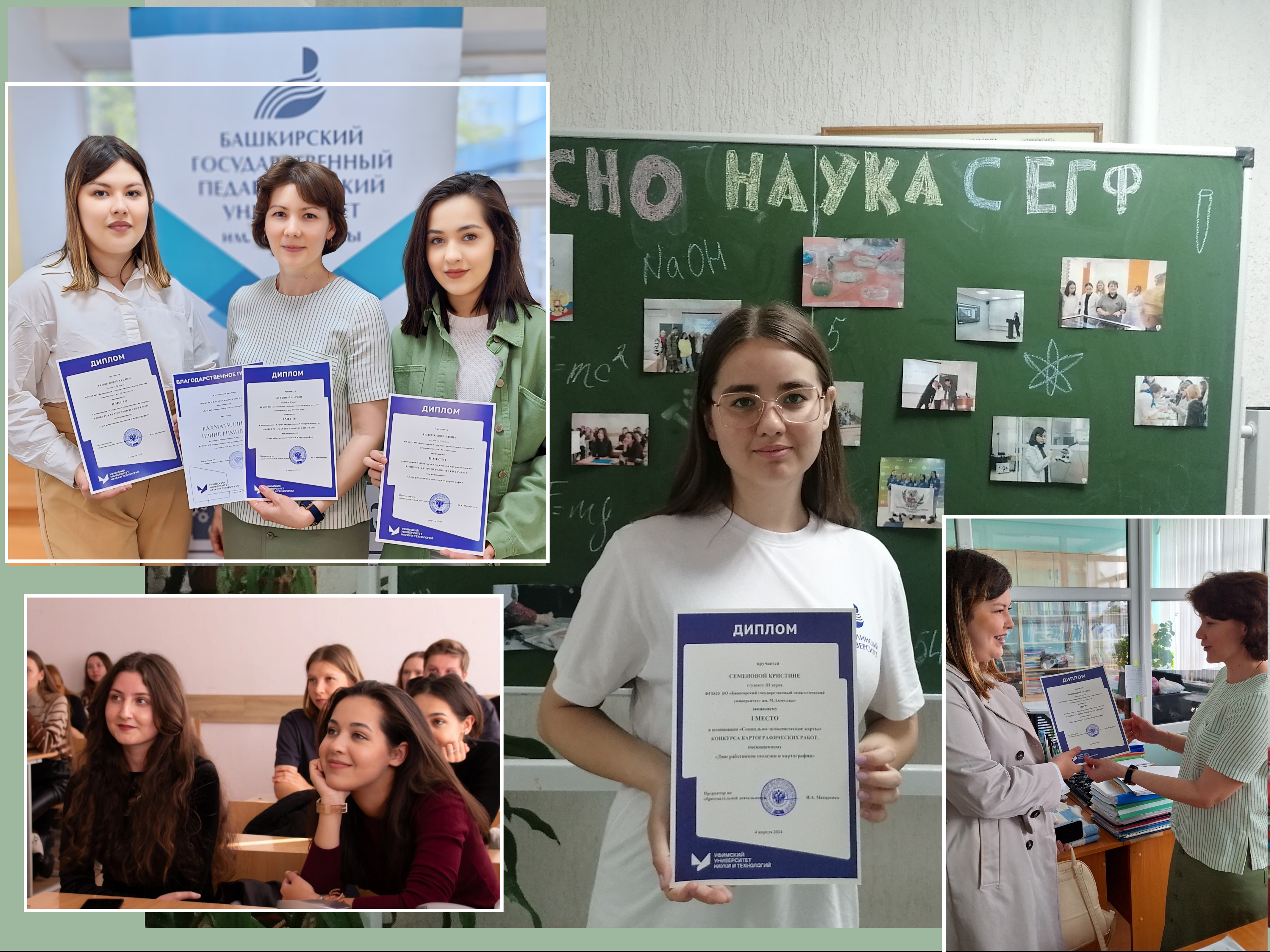 Студенты естественно-географического факультета под руководством доцента И.Р. Рахматуллиной заняли призовые места в конкурсе картографических работ (номинация "Социально-экономические карты"), проведенной Уфимским университетом науки и технологий: 1 место - Семенова Кристина, 2 место - Рашитова Азалия. В номинации «Карты экологической направленности»: 1 место – Мусина Карина, 2 место – Халитова Элина. Призерами стали студенты 1 и 2 курсов направления Педагогическое образование, профиль «География и биология» и направления Экология и природопользование, профиль «Природопользование».