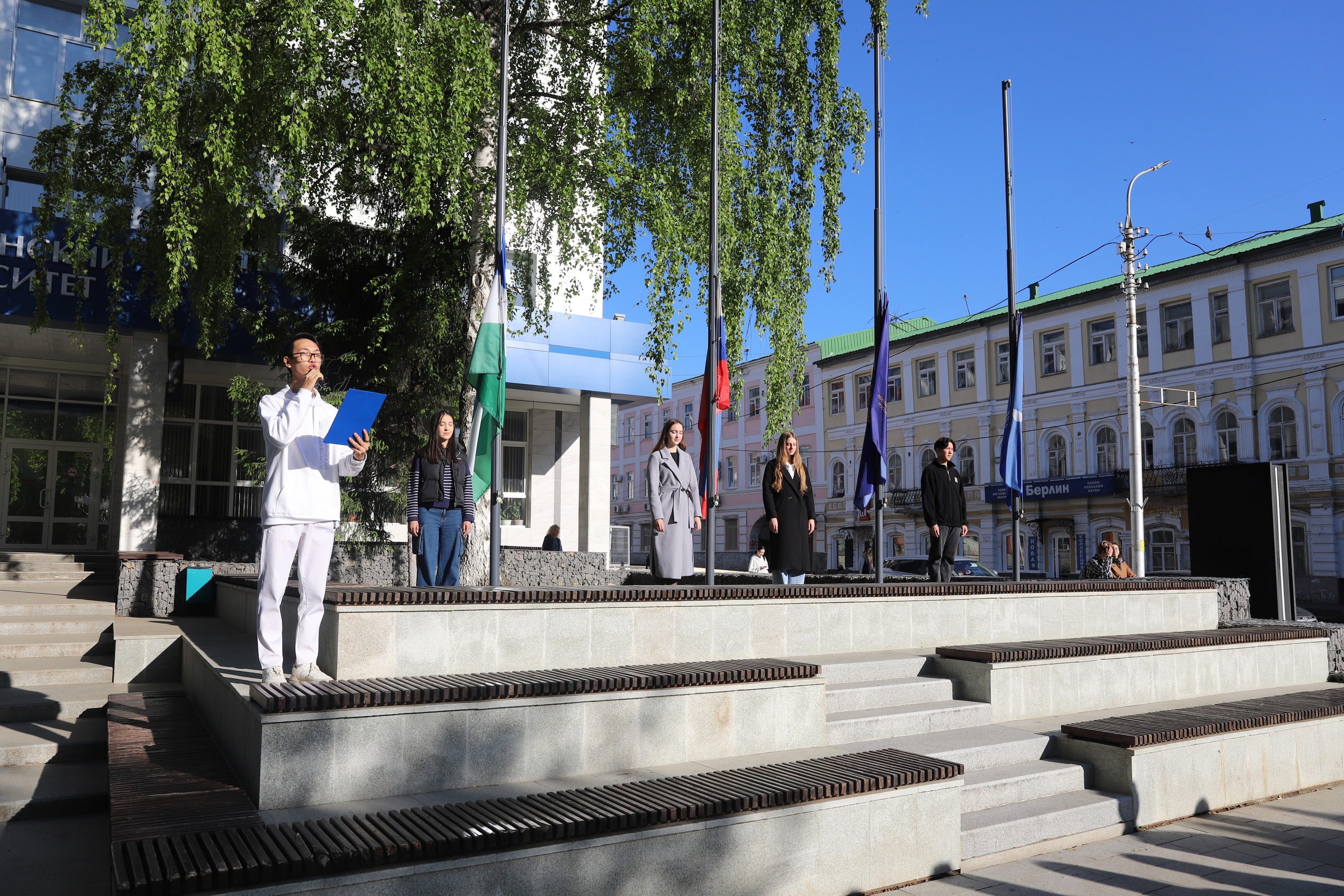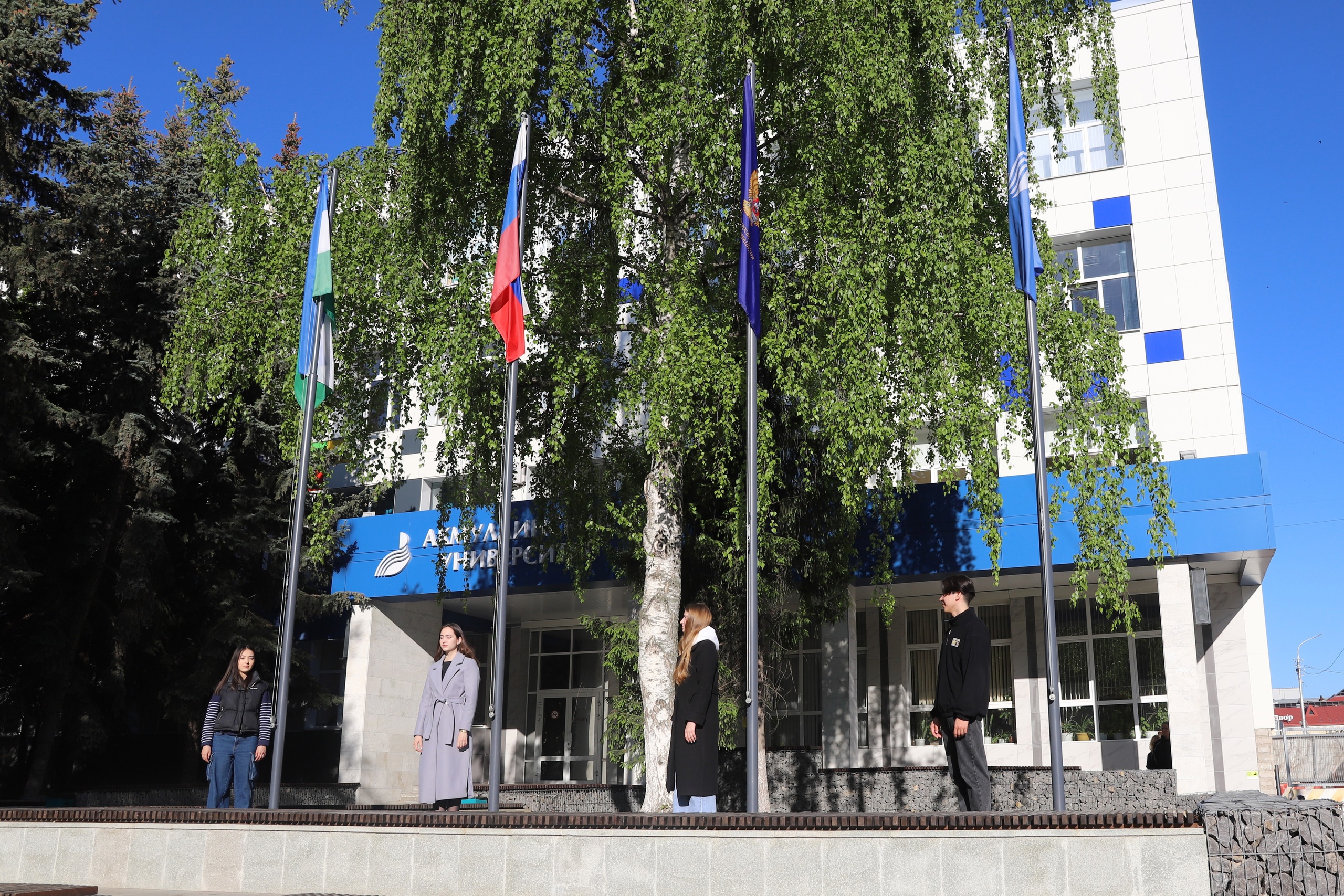 20 мая перед первым корпусом Башгоспедуниверситета состоялась еженедельная торжественная церемония поднятия Государственного флага Российской Федерации, флага Республики Башкортостан, Министерства просвещения Российской Федерации и Акмуллинского университета. В ней приняли участие студенты и преподаватели естественно-географического факультета БГПУ имени М.Акмуллы.