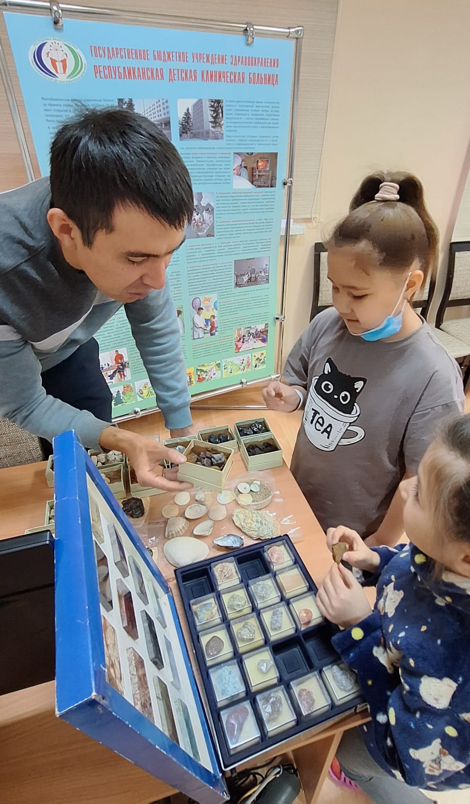 В рамках благотворительной программы "Территория здорового детства" 2 ноября 2024 г. старшие преподаватели кафедры экологии, географии и природопользования Роман Халитов, Галия Мухаметова и студентка 2 курса Алия Дмитриева посетили Республиканскую детскую клиническую больницу. Для маленьких пациентов и их родителей они продемонстрировали коллекцию геологических образцов, дети смогли узнать много нового об окружающем мире. Роман Маратович рассказал им о различных минералах и их свойствах, каждый ребенок смог подержать камни в руках и рассмотреть их. По предложению  Галии Миниахметовны родители с удовольствием собирали карту-пазл Республики Башкортостан. «Мы очень рады, что смогли порадовать детей и сделать их день немного ярче, – поделилась Алия студентка естественно-географического факультета. – Для нас важно не только делиться знаниями, но и поддерживать тех, кто нуждается в помощи».