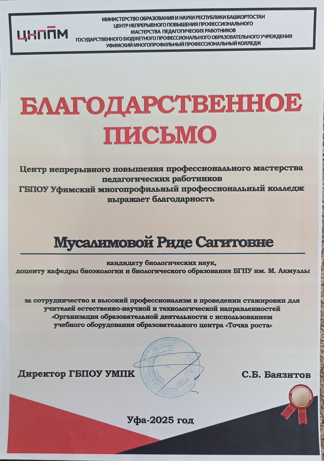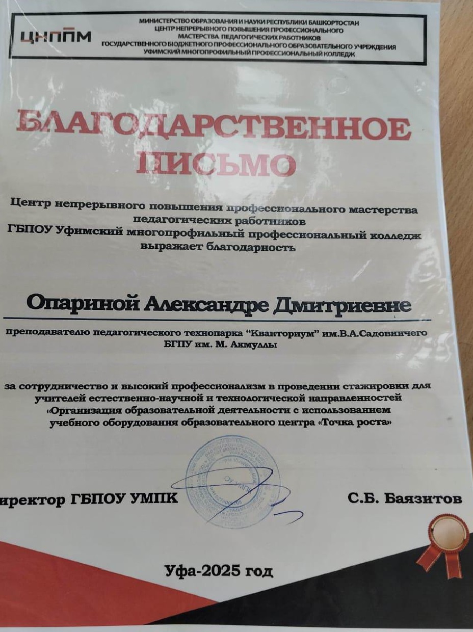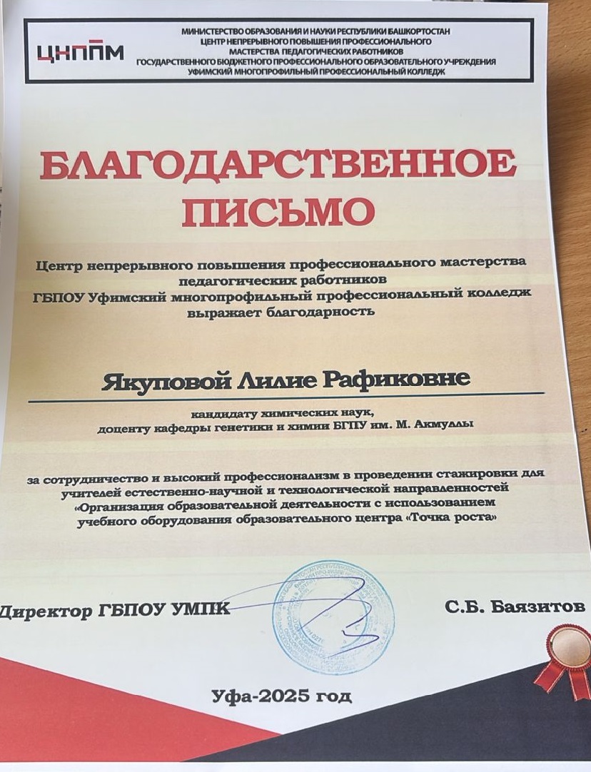 Преподаватели факультета -  Р.С.Мусалимова, Л.Р.Якупова, а также лаборант  А.Д.Опарина получили благодарственные письма от Центра непрерывного повышения профессионального мастерства педагогических работников ГБПОУ УМПК за сотрудничество и высокий профессионализм в проведении стажировки для учителей естественно-научной и технологической направленностей «Организация образовательной деятельности с использованием учебного оборудования образовательного центра «Точка роста».