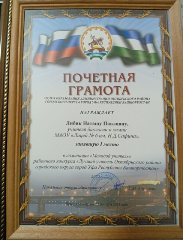 Студент 5 курса Либик Наташа Павловна ­- обучающаяся по направлению 44.03.05 Педагогическое образование (с двумя профилями подготовки) направленность (профиль) «Биология и химия»,  работающая учителем биологии и химии в МАОУ «Лицей №6» ­ - стала победителем конкурса «Лучший учитель Октябрьского района ГО г.Уфа» в номинации «Молодой учитель».