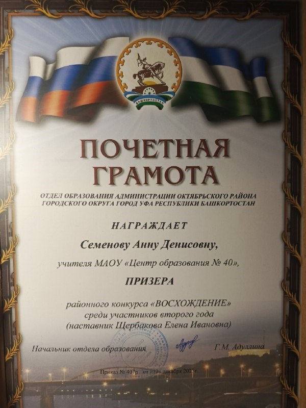 Студент 5 курса Семенова Анна Денисовна - обучающаяся по направлению 44.03.05 Педагогическое образование (с двумя профилями подготовки) направленность (профиль) «География и биология»,  работающая учителем биологии и географии в МАОУ «Центр образования №40» - стала призером районного конкурса «Восхождение» среди участников второго года (наставник Щербакова Елена Ивановна).