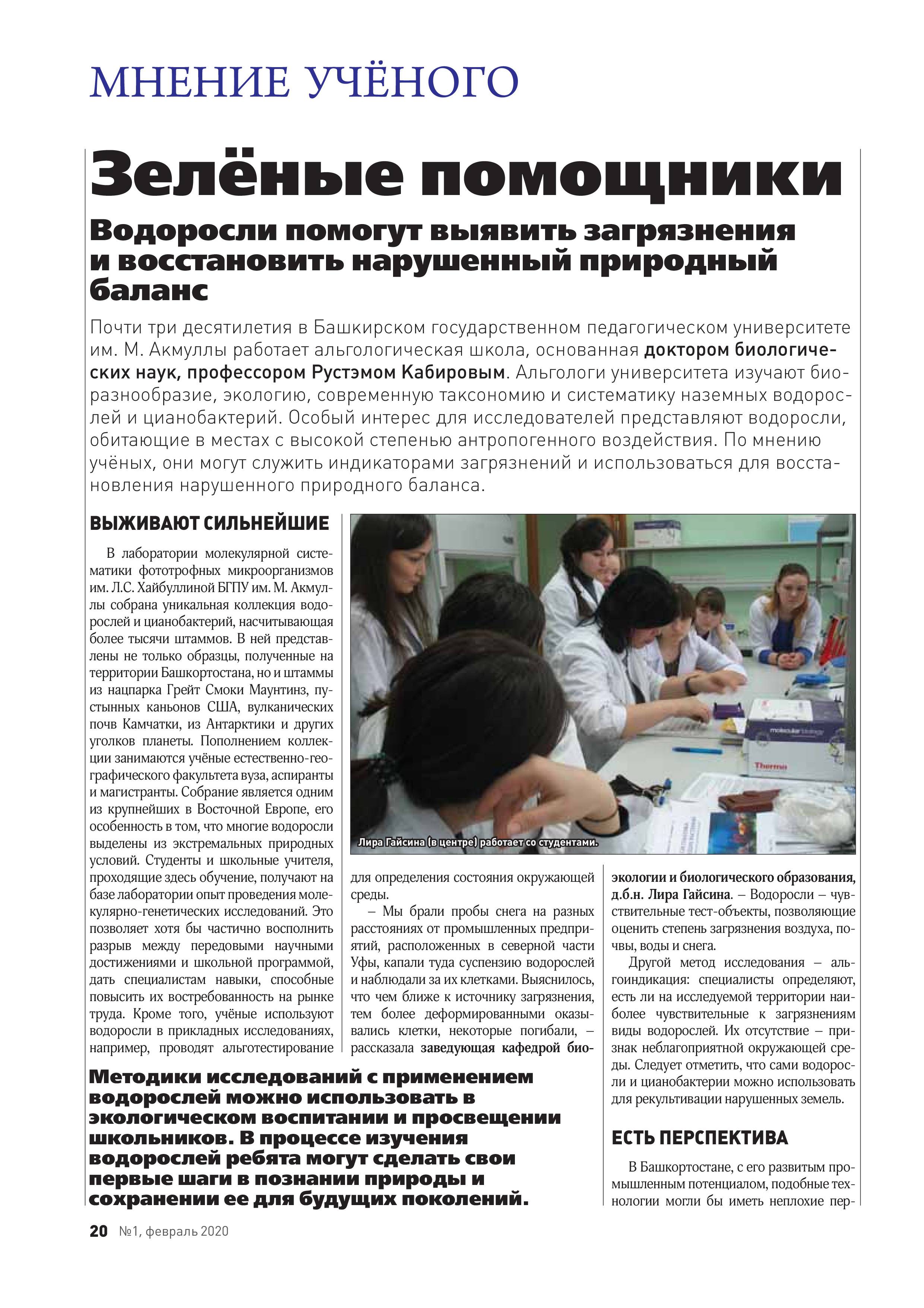 В лаборатории молекулярной систематики фототрофных микроорганизмов им. Л.С. Хайбуллиной БГПУ им. М. Акмуллы собрана уникальная коллекция водорослей и цианобактерий, насчитывающая более тысячи штаммов. В ней представлены не только образцы, полученные на территории Башкортостана, но и штаммы из нацпарка Грейт Смоки Маунтинз, пустынных каньонов США, вулканических почв Камчатки, из Антарктики и других уголков планеты. Пополнением коллекции занимаются учёные естественно-географического факультета вуза, аспиранты и магистранты. Собрание является одним из крупнейших в Восточной Европе, его особенность в том, что многие водоросли выделены из экстремальных природных условий. Студенты и школьные учителя, проходящие здесь обучение, получают на базе лаборатории опыт проведения молекулярно-генетических исследований. Это позволяет хотя бы частично восполнить разрыв между передовыми научными достижениями и школьной программой, дать специалистам навыки, способные повысить их востребованность на рынке труда. Кроме того, учёные используют водоросли в прикладных исследованиях, например, проводят альготестирование для определения состояния окружающей среды.