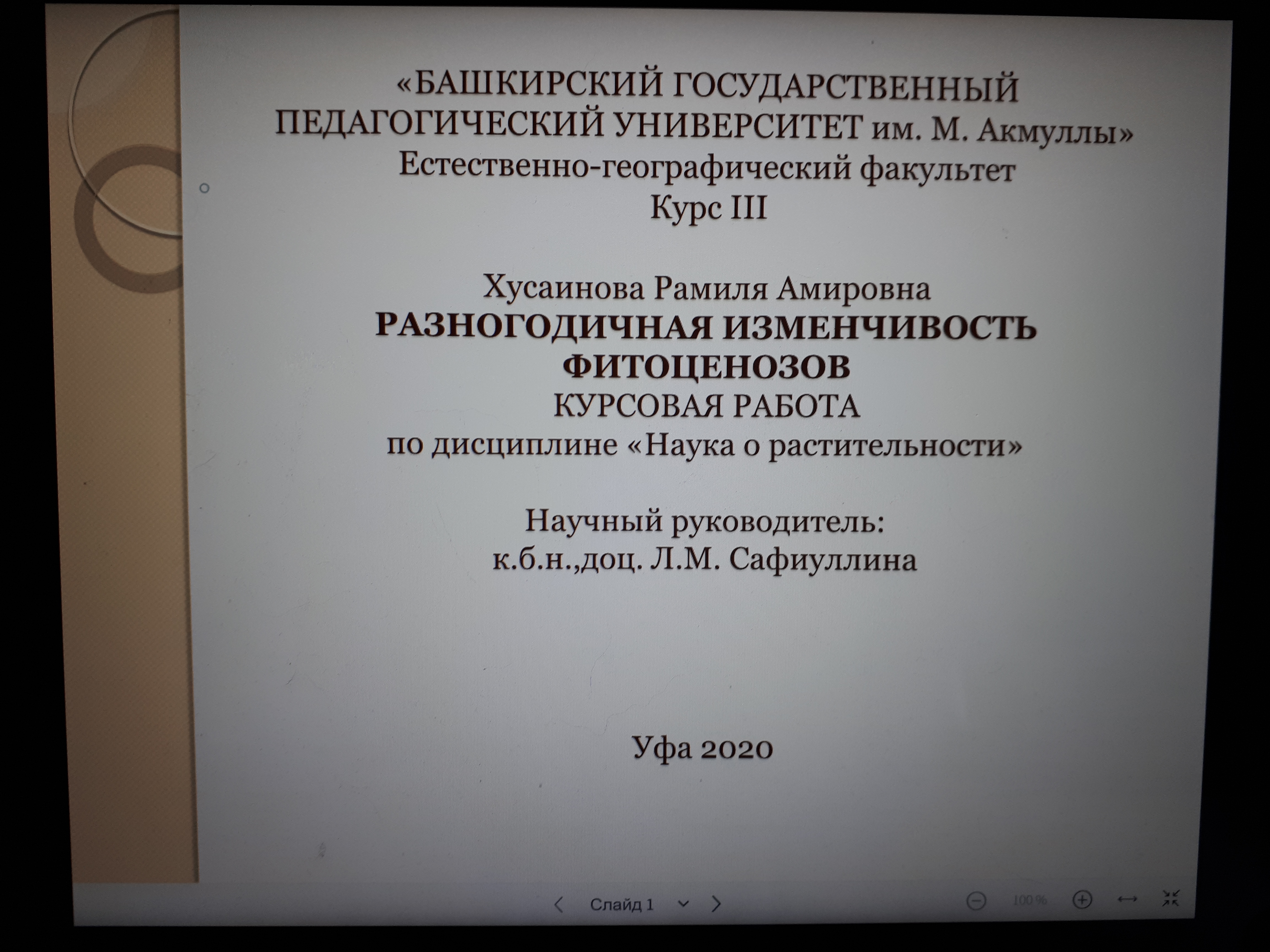11 декабря 2020 года на кафедре биоэкологии и биологического образования в онлайн формате на платформе ЛМС успешно прошла защита курсовых работ по дисциплине «Наука о растительности» у бакалавров 3 курса направления 06.03.01 «Биология», профиль «Биоэкологи»". Руководителем курсовых работ является кандидат биологических наук, доцент Сафиуллина Лилия Мунировна.