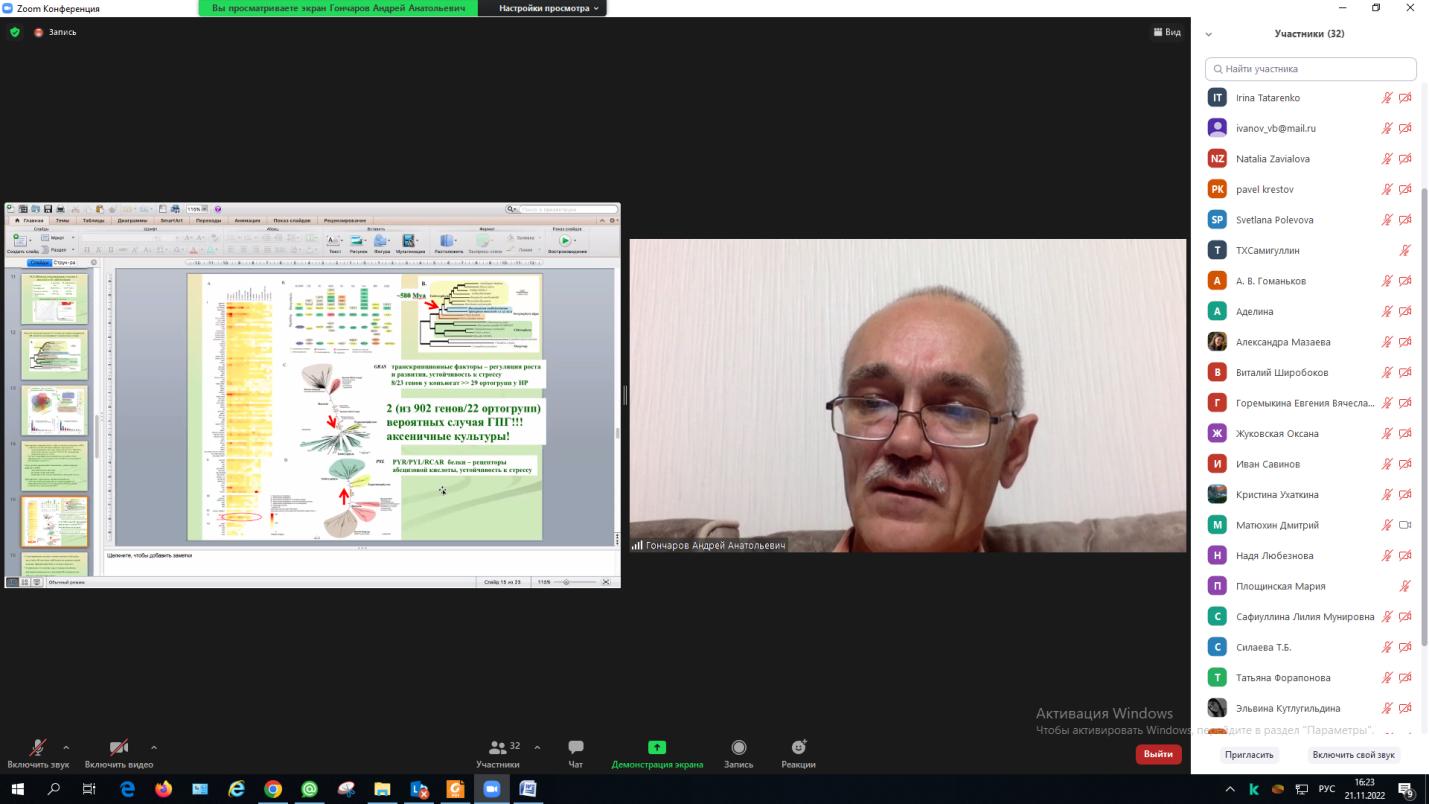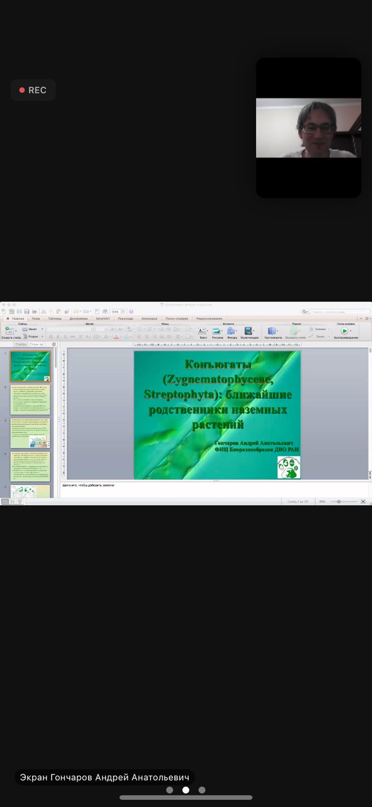 21 ноября 2022 г.  состоялся онлайн-семинар для студентов и преподавателей естественно-географического факультета на тему «Конъюгаты (Zygnematophyceae, Streptophyta): ближайшие родственники наземных растений». Его провел член-корреспондент РАН, профессор кафедры биоэкологии и биологического образования БГПУ им. М.Акмуллы, директор ФНЦ Биоразнообразия ДВО РАН Андрей Гончаров.