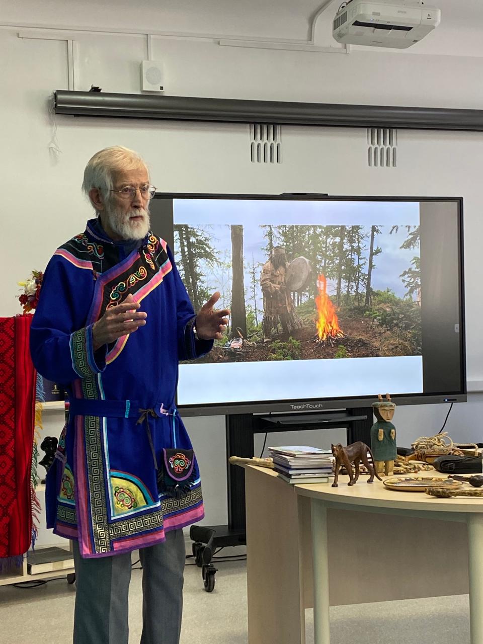 Гость рассказал о своем жизненном пути, становлении и развитии как прозаика и писателя-натуралиста, достижениях и творческих планах, впечатлениях от поездок по стране и миру. Рассказ ученого-путешественника сопровождался показом настоящих предметов быта, амулетов, а также элементов одежды представителей народов тех стран, в которых ему удалось побывать. Были представлены книги о животных — «Маха», «Щедрый Буге», «Боцман», «Скитники» и др.