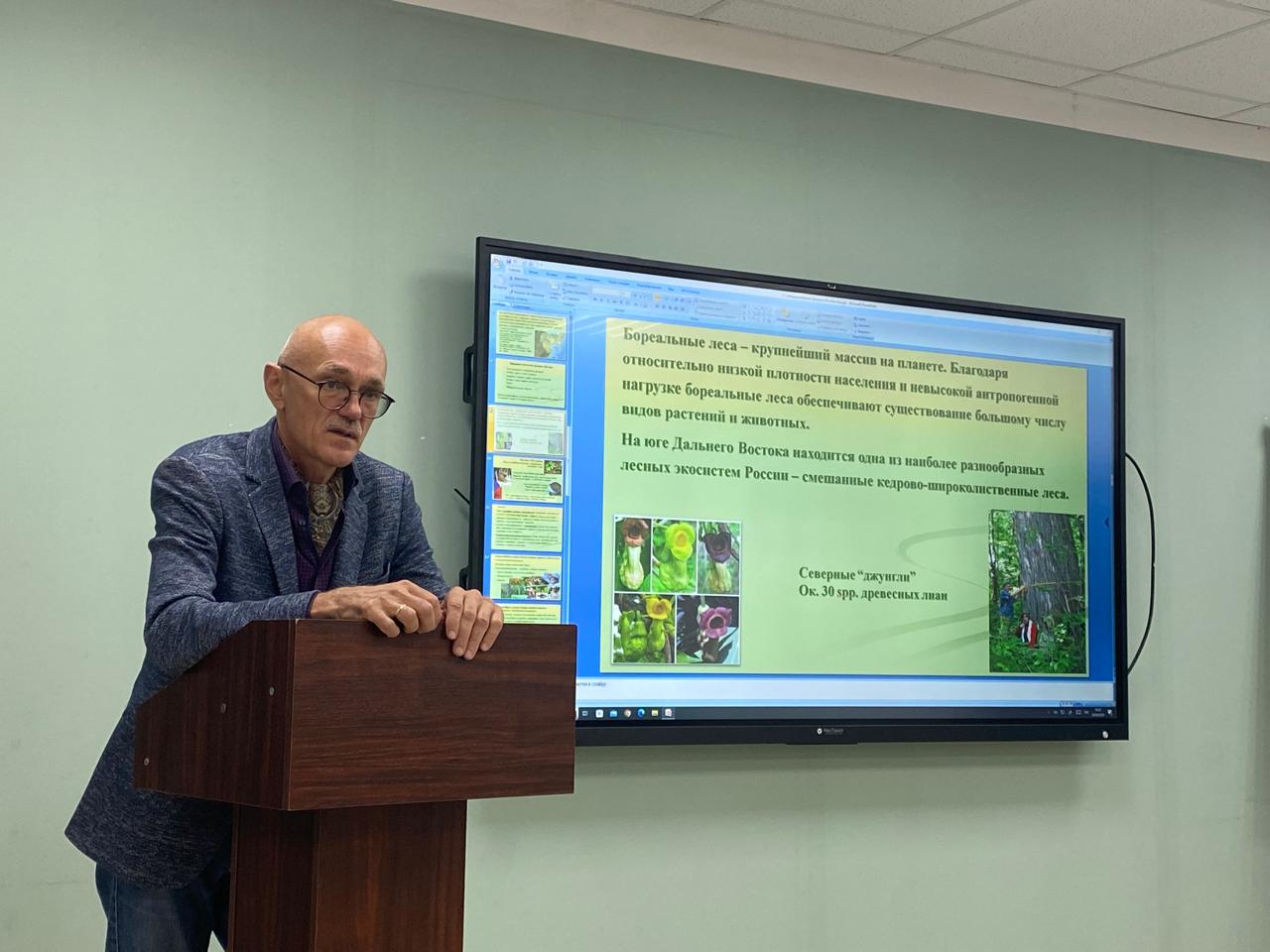 С 30 сентября по 4 октября директор ФНЦ биоразнообразия наземной биоты Восточной Азии ДВО РАН, член-корреспондент РАН, доктор биологических наук Андрей Анатольевич Гончаров прочитал курс лекций для студентов и магистрантов естественно-географического факультета. Тематика лекций была направлена на изучение биоразнообразия Дальнего Востока России, его ресурсного потенциала, особое внимание было уделено использованию растений в биотехнологии, способам повышения продуктивности вторичных метаболитов в культуре клеток лекарственных растений методами генетической инженерии, подробно Андрей Анатольевич остановился на характеристике отдельных групп лекарственных растений, таких как Panax ginseng, Gastrodia elata, Rhodiola rosea. 3 октября Андрей Гончаров провел мастер-класс для преподавателей и студентов биологов по построению филогенетических деревьев водорослей и цианобактерий.