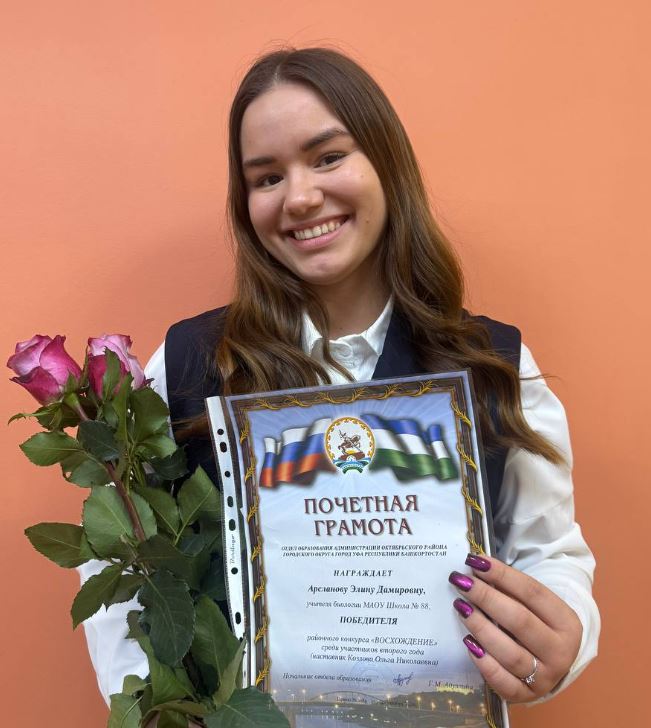 Студентка 5 курса направления Педагогическое образование профиль Химия и Биология Элина Арсланова, является учителем биологии МАОУ Школа №88.