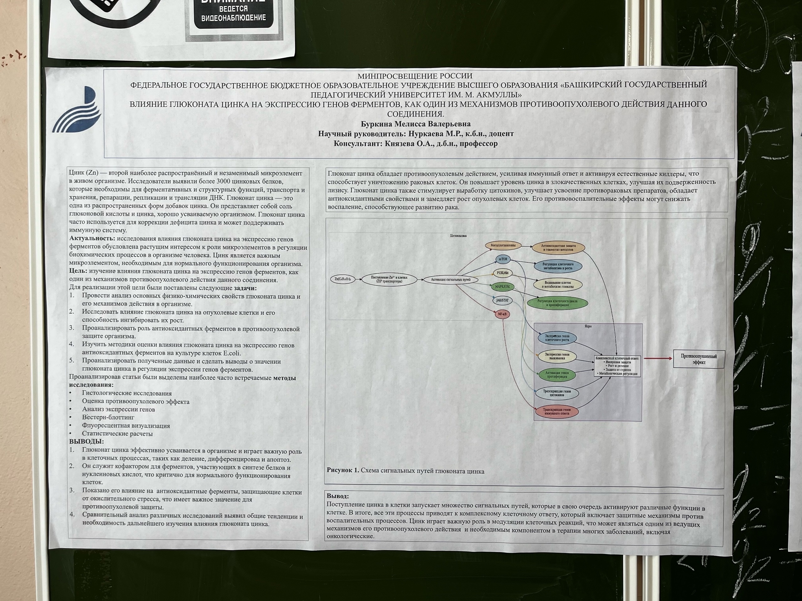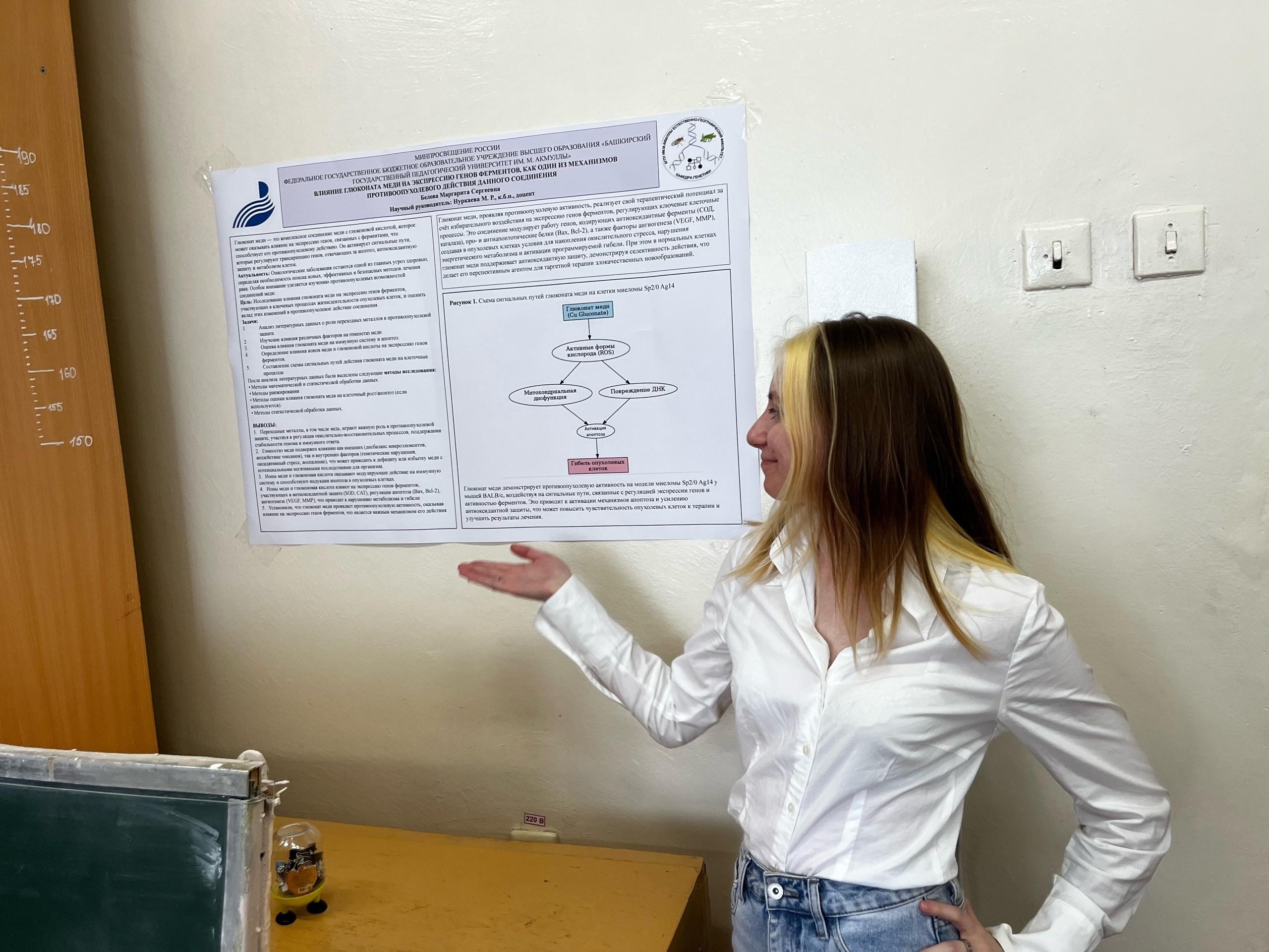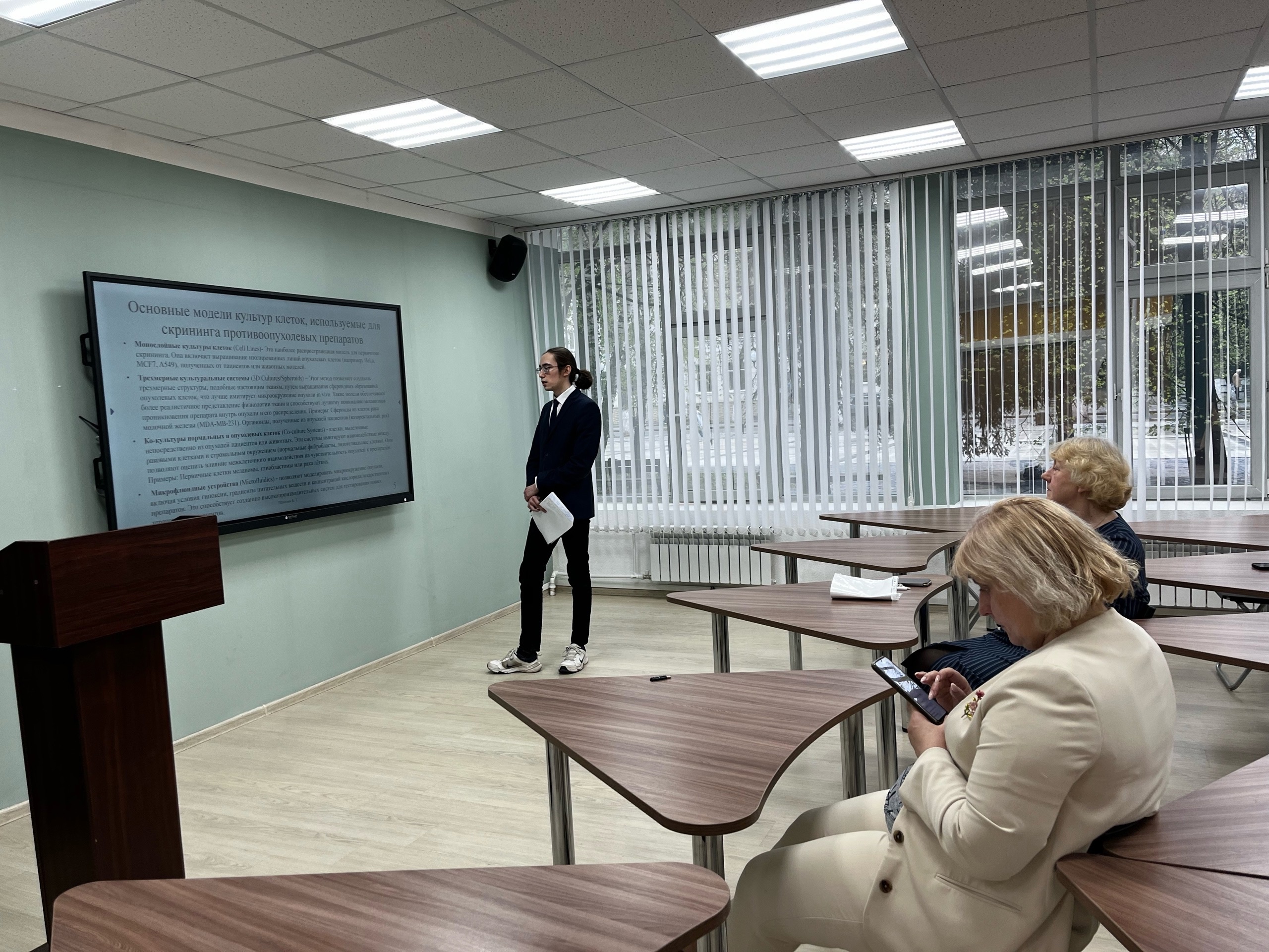 Псянчин Байрас Тимурович представил свою работу на тему "Модели культур клеток для скрининга противоопухолевых препаратов". В своём докладе он осветил важность клеточных культур в разработке и тестировании новых противоопухолевых средств. Байрас объяснил, как клеточные модели позволяют исследовать механизмы действия различных веществ на раковые клетки, а также оценивать их эффективность и безопасность. Он продемонстрировал несколько примеров моделей клеточных культур, которые использовались в исследованиях, и рассказал о методах, применяемых для анализа результатов. Байрас также обсудил перспективы использования этих моделей в клинических испытаниях и подчеркнул, что дальнейшие исследования в этой области могут привести к значительным прорывам в лечении рака.