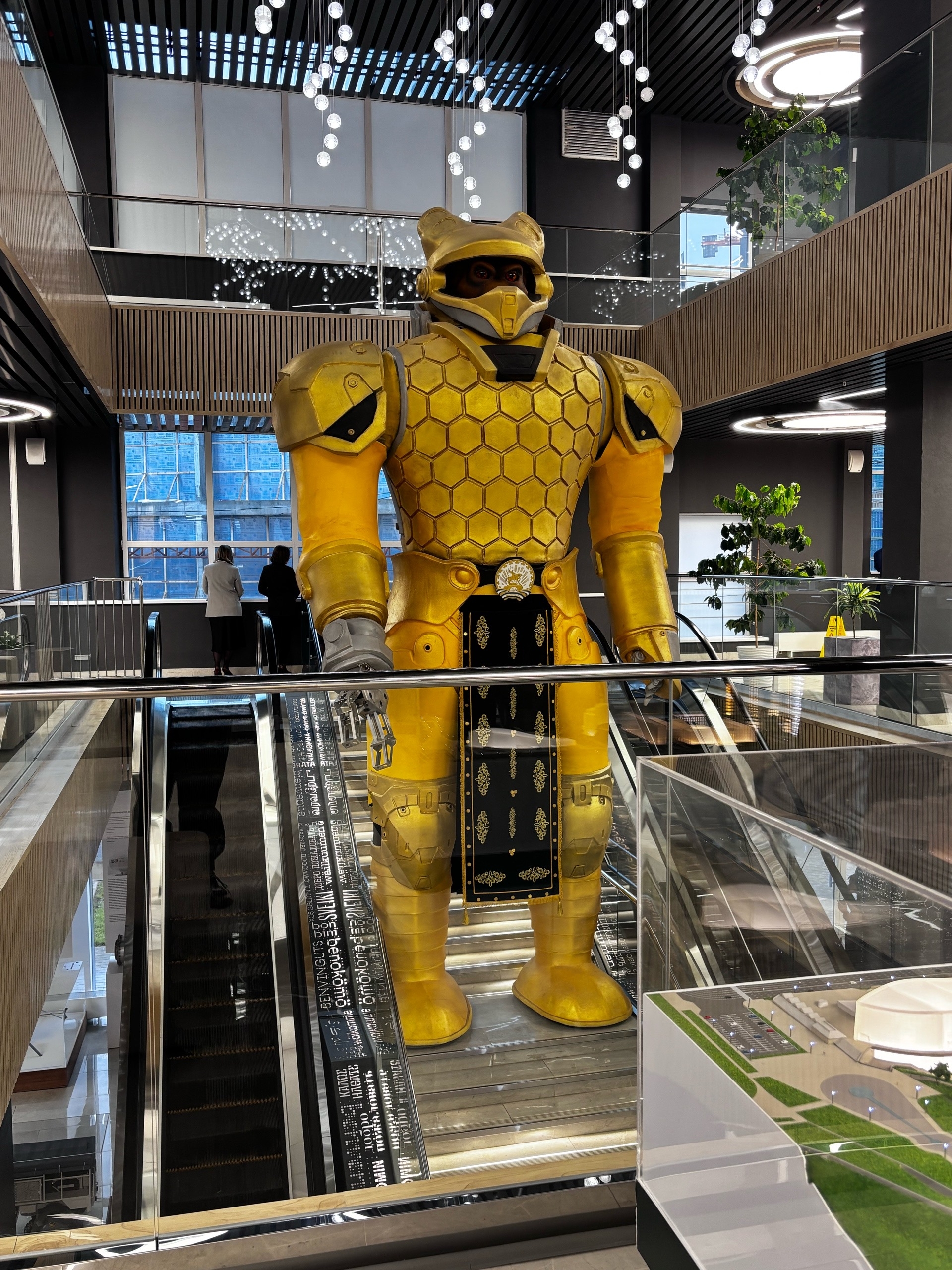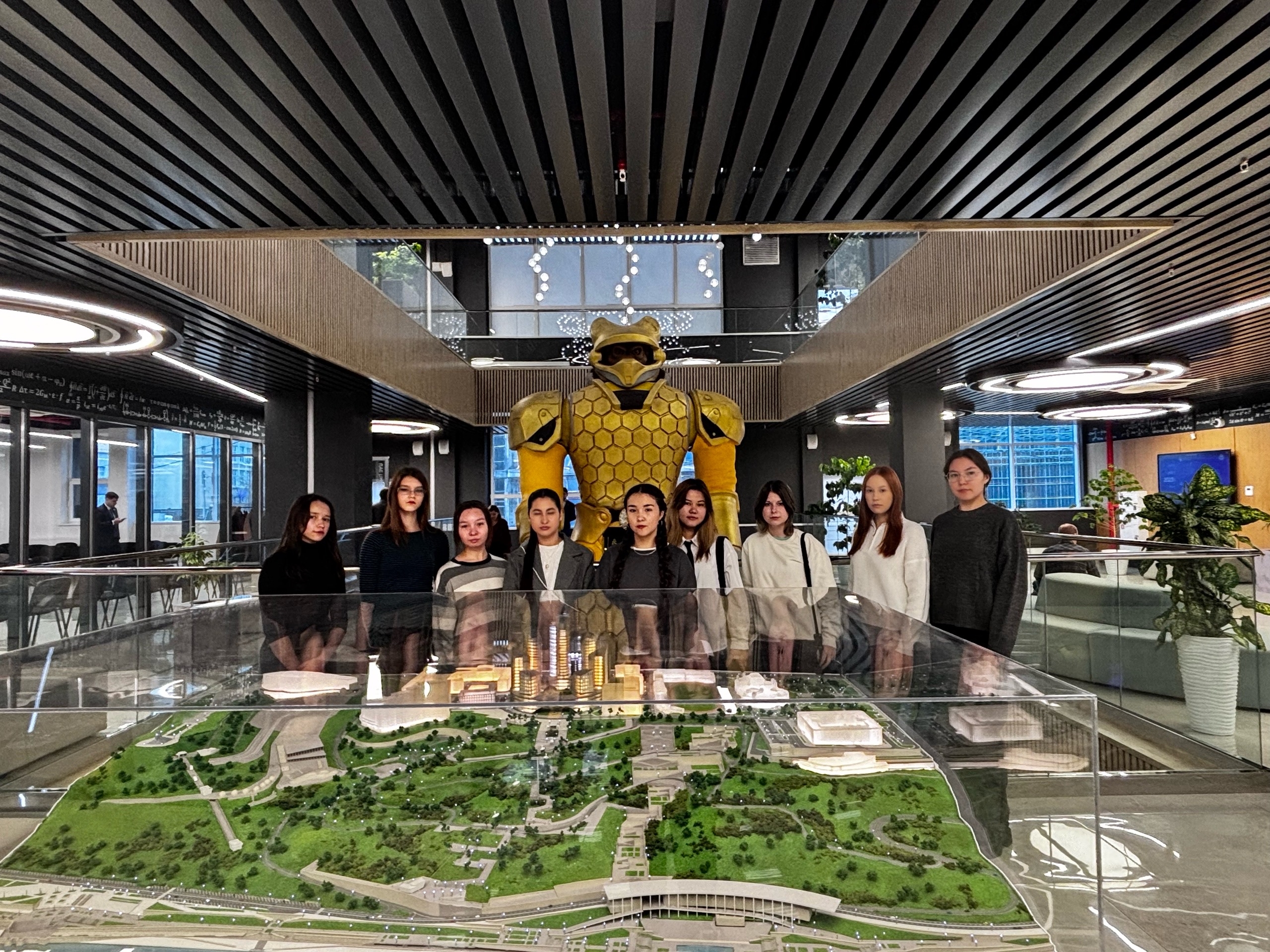 Гостей сразу поразила уникальная статуя робота-медведя – символ инноваций, сочетающий силу природы и высокие технологии. Затем экскурсовод представила амбициозные планы по развитию кампуса: детальный макет центральной части Уфы за стеклом позволил "прогуляться" по будущим корпусам и паркам города. В самом кампусе каждая деталь интерьера – от декоративных элементов до мебели – несет отпечаток науки: формулы ДНК на стенах, молекулярные модели в декоре и даже лампы в форме спирали генома.