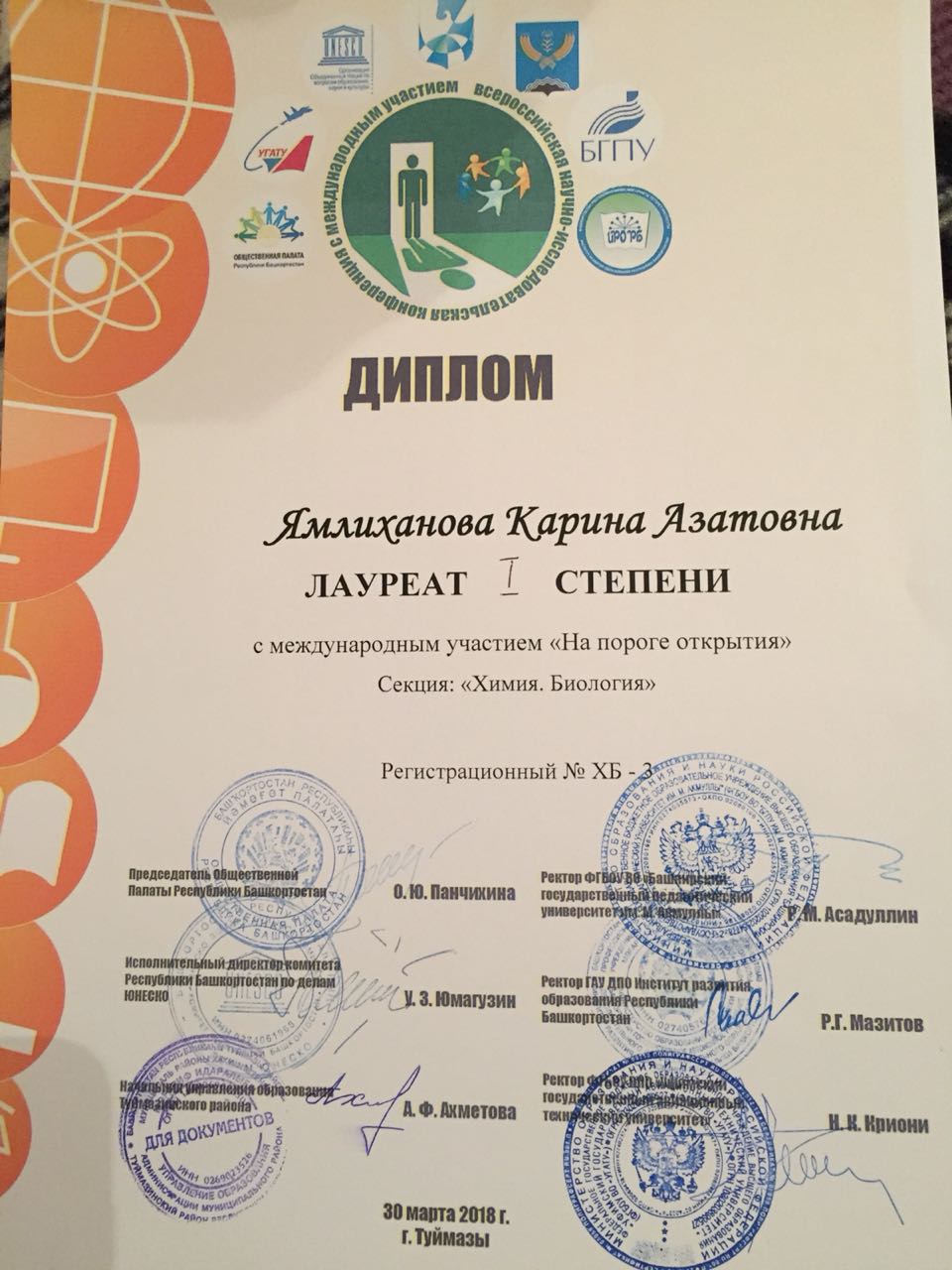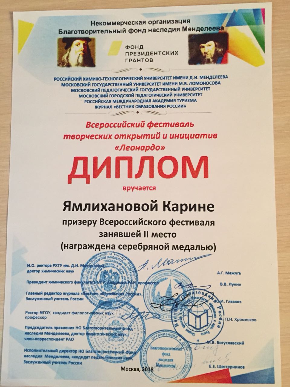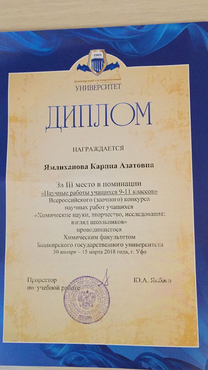 Всероссийской научно-исследовательской конференции с международным участием в городе Туймазы. Эта работа была также представлена на Всероссийском фестивале творческих открытий и инициатив «Леонардо» в г. Москве и получила диплом за второе место (награждена серебряной медалью). Она также участвовала в работе Всероссийского конкурса научных работ учащихся «Химические науки, творчество, исследования: взгляд школьников» в г. Уфе и заняла третье