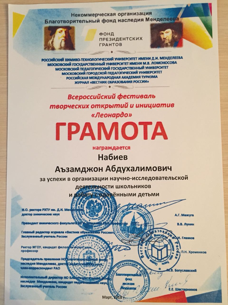 Ученица этой же школы Амирханова К.А. под руководством аспиранта 2-го года обучения Набиева А.А. выполняла работу на тему «Растворимость солей в водно-этанолных растворах» и была удостоена диплома I первой степени