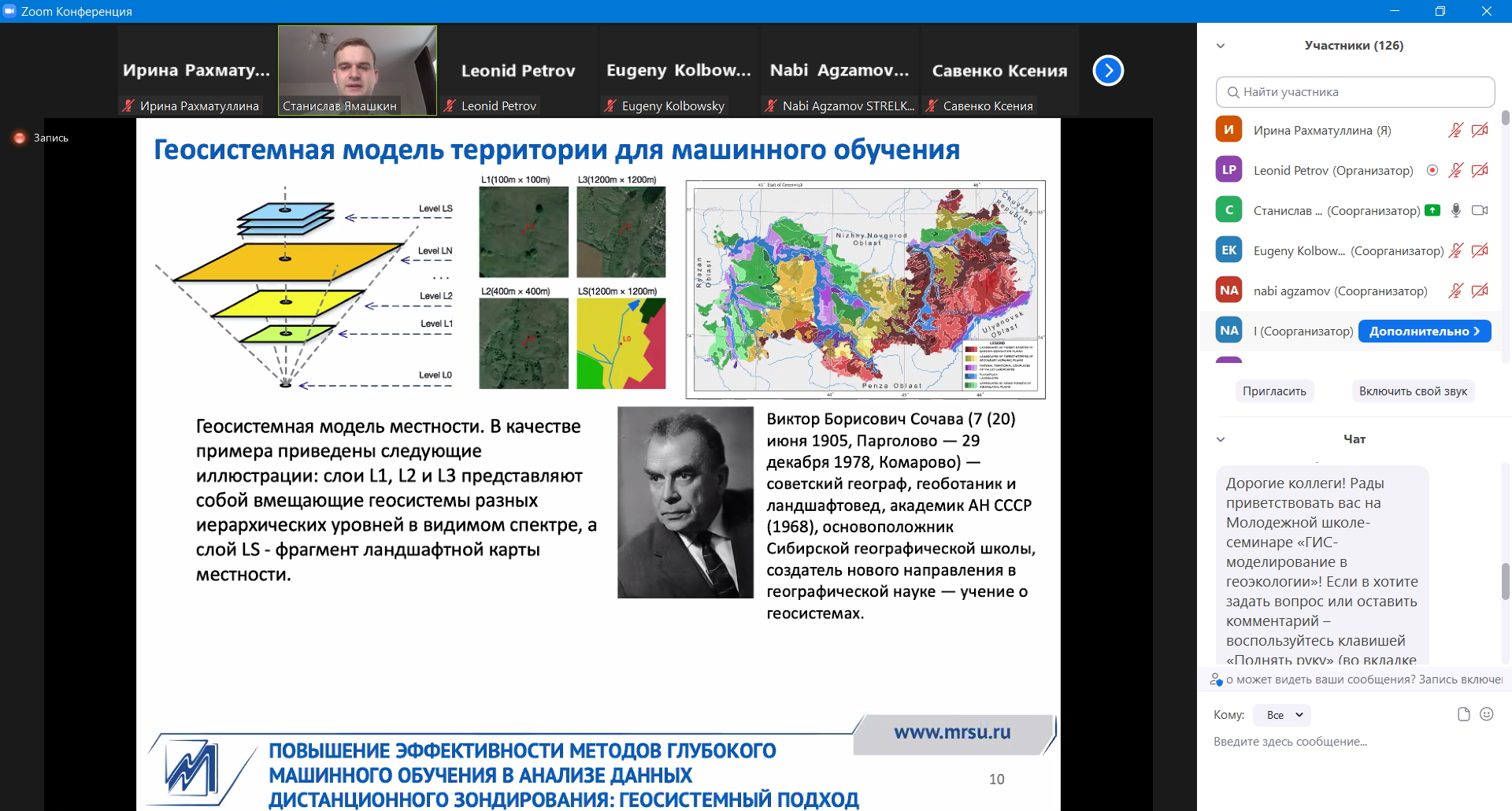 Молодежная школа-семинар проводилась кафедрой физической географии мира и геоэкологии Московского государственного университета им. М.В.Ломоносова. В ходе работы были заслушаны доклады: Повышение эффективности методов глубокого машинного обучения в анализе данных дистанционного зондирования: геосистемный подход (С.А.Ямашкин); Технологии дистанционного зондирования Земли и ландшафтный урбанизм (Н.Агзамов);  Картографирование пространственной неоднородности почвенно-земельного покрова на основе больших спутниковых данных и анализ причин ее формирования (Д.И.Рухович); Поиск внезапных изменений лесного покрова на основе анализа временных рядов космоснимков в earthengine.google (Д.АКолесов); Использование Google Earth Engine для создания карт растительности и природопользования на региональном и глобальном масштабах (И.ВГлушков); Трансформация школьной сети Ярославской области на примере Пошехонского района (П.Н.Брагин); ArcGISPro - новые возможности геоинформационного моделирования (Д.А.Третьяченко). Мастер-класс, проводимый представителями компании ESRI А.Максимовым и О.Ушаковой, был посвящен анализу, оформлению карт и созданию приложений в ArcGIS Online.