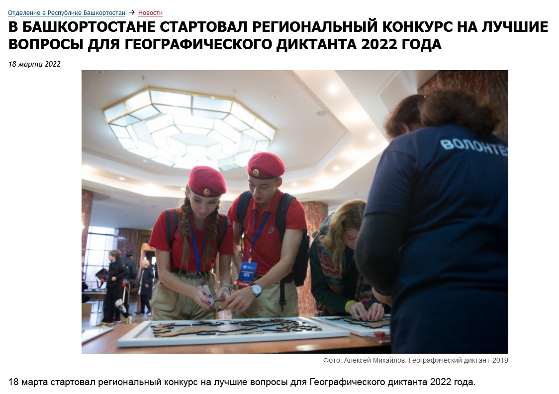 Географический диктант — международная просветительская акция РГО, которая пройдёт уже в восьмой раз. По традиции в этом году мы продолжаем разрабатывать вопросы Диктанта с вашей помощью. Любой желающий может одновременно принять участие в Международном конкурсе "Напиши свой вопрос для Географического диктанта" и в любом из региональных конкурсов "Напиши свой вопрос для Географического диктанта". Форма для размещения своего вопроса доступна по ссылке https://www.rgo.ru/ru/bashkort...