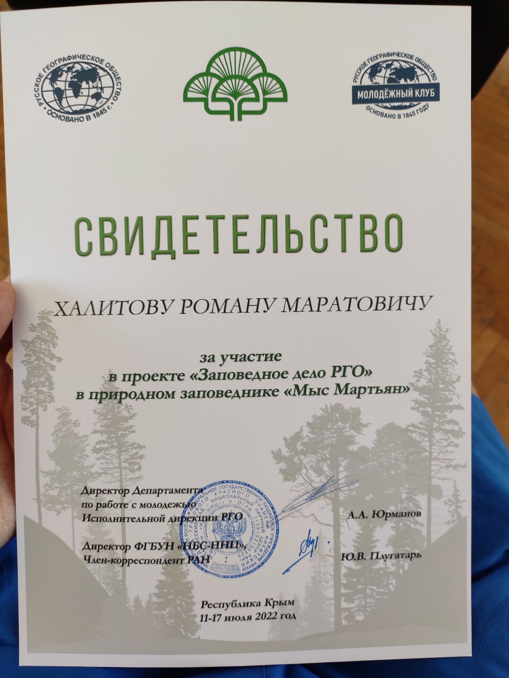 "В результате проведённых исследований было выявлено, что основными древесными растениями на мысе Мартьян являются можжевельник высокий и колючий, земляничник мелкоплотный, которые внесены в красную книгу Республики Крым, а также дуб пушистый. Вчера нам посчастливилось посетить лабораторию агроэкологии, мы подробно узнали о проводимых здесь исследованиях и ознакомились со многим оборудованием. Сейчас все участники, на основе собранных материалов, пишут научные статьи и тезисы. В рамках проекта "Заповедное дело РГО" мной было проведено исследование о влиянии почвенных условий на растительный покров, на основе почвенных горизонтов, одним из которых стал эталонный почвенный разрез красно-коричневой почвы на продуктах выветривания верхнеюрских известняков", - поделился своими впечатлениями участник проекта "Заповедное дело РГО", активист МК РГО " ГеоЛог" Роман Халитов.