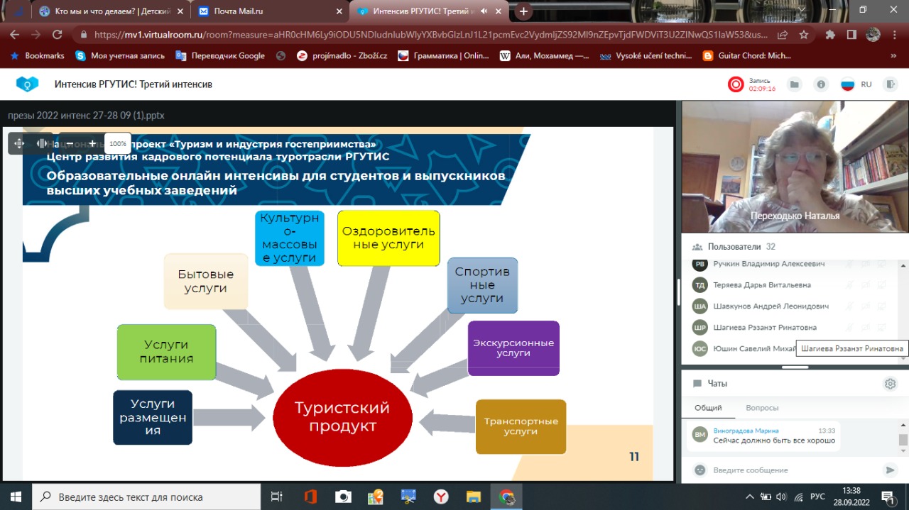 Студенты направления Туризм 3 курс в рамках образовательной деятельности приняли участие в онлайн-мероприятии «Интенсив РГУТИС!». Это был Третий интенсив в рамках Национального проекта «Туризм и индустрия гостеприимства» от Центра развития кадрового потенциала туротрасли ФГБОУ ВО «РГУТИС» г. Москва, организованный 27-28 сентября 2022 г. Наибольший интерес вызвали лекции на тему «Инновационные методы создания турпродуктов. Необходимые компетенции специалистов туриндустрии в современных условиях» от Макеевой Ольги Сергеевны (рук. отд. туризма  ГК «АВИТЕКС») и «Для чего нужны ТИЦ?» от Шустиковой Натальи (директор АНО ТИЦ Саратовской области). Полученные знания пригодятся студентам в практической деятельности.