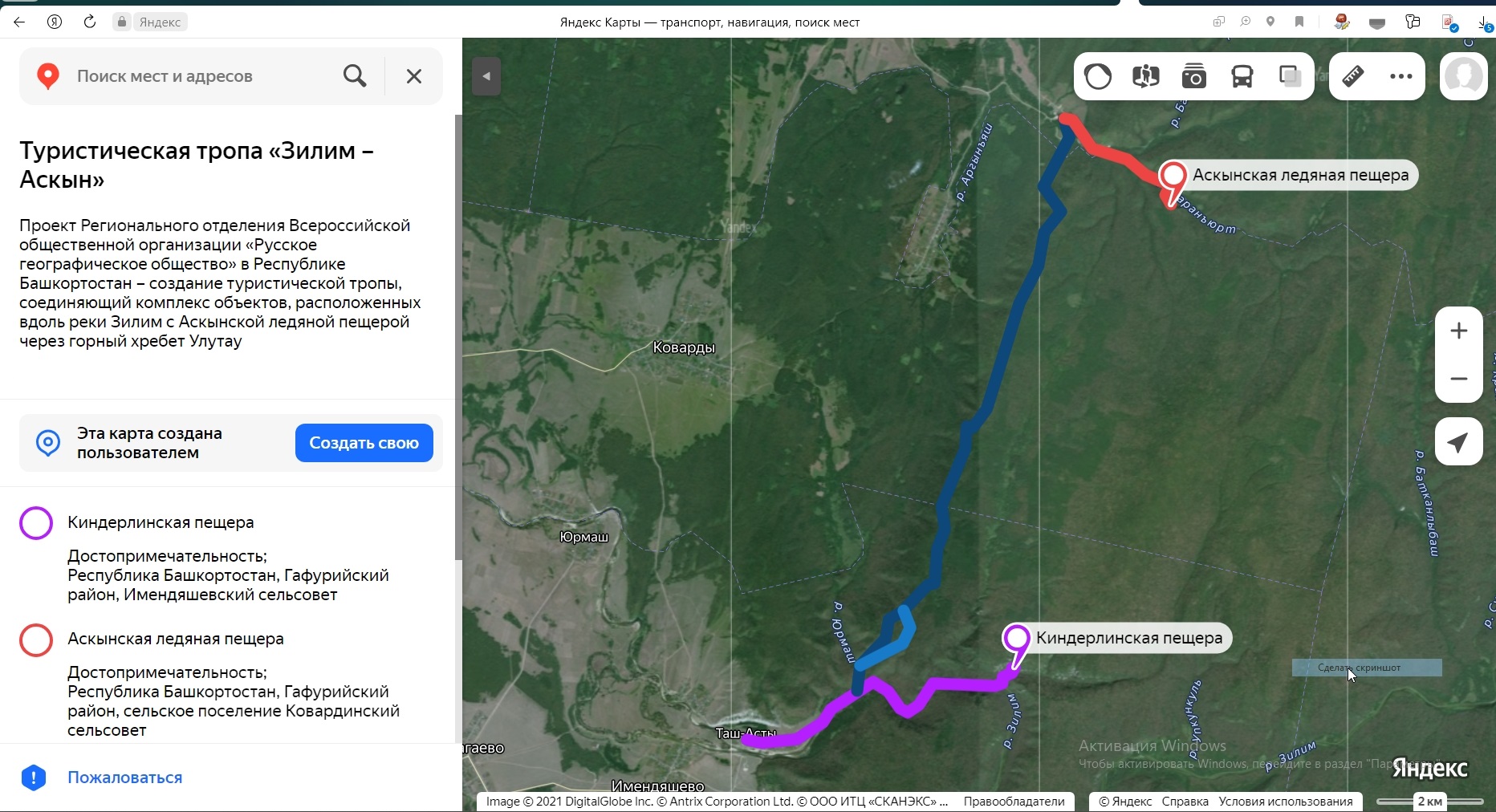 После выбора нитки маршрута, его расчистки и маркировки на местности, для обеспечения безопасности путешественников необходимо было создать трек нового маршрута, который был бы доступен для посетителей тропы, в первую очередь на информационных щитах.  Интерактивная карта туристического маршрута «Зилим – Аскын» была создана магистрантом 1 курса ЕГФ Данилом Денисовым на онлайн-платформе «Конструктор карт Яндекс Карты».
