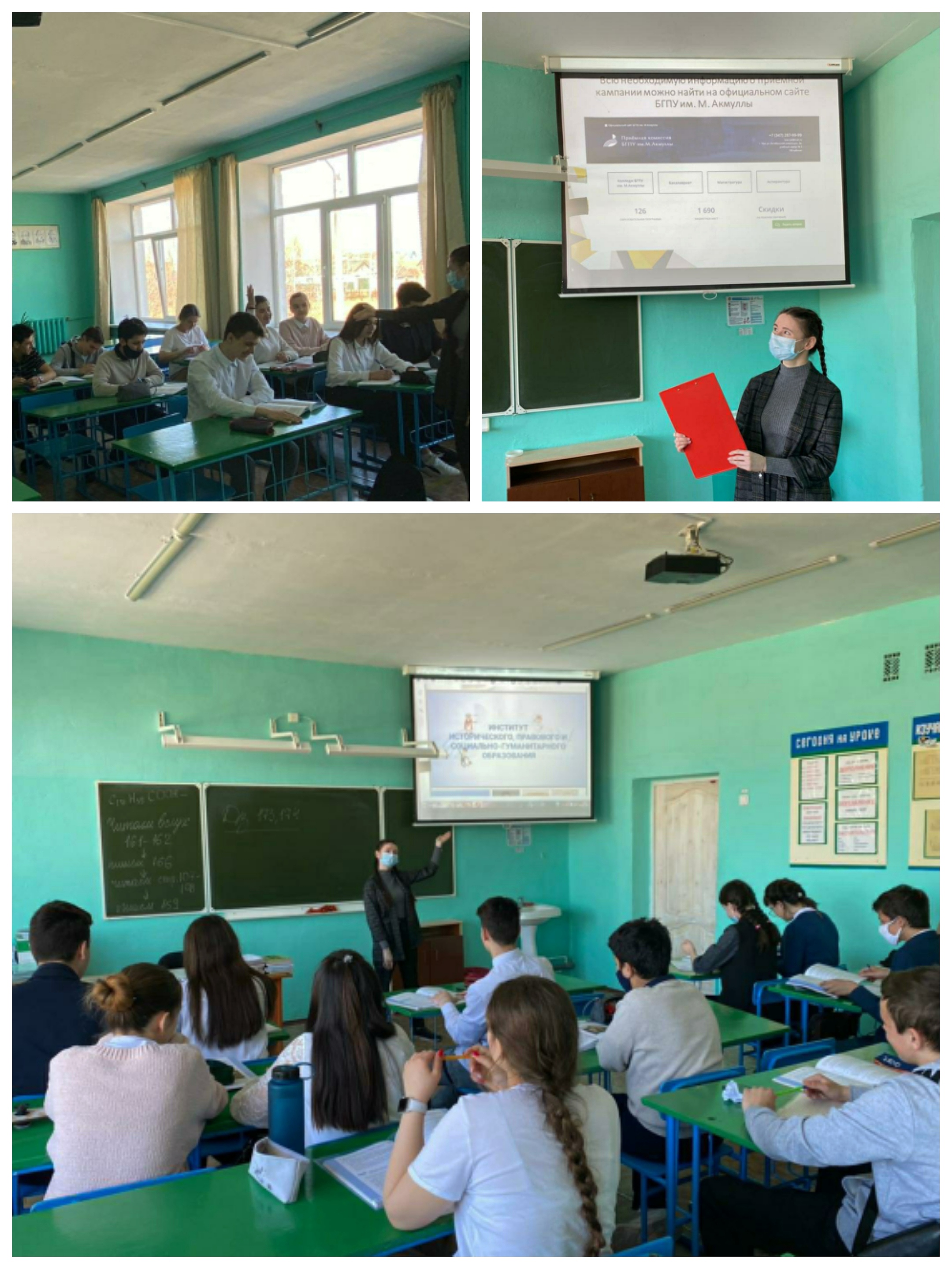 16 апреля 2021 г. на базе МОБУ СОШ д.Алексеевка прошло профориентационное мероприятие (Шамиданова Виктория). Ребята узнали о структуре Акмуллинского университета, о специфике направлений подготовки ИИПСГО. Особый интерес вызвала студенческая жизнь вне учебных занятий: мероприятия, кружки, конференции, студенческий совет. Ребята выразили желание при первой же возможности посетить университет в рамках Дня открытыхдверей. В конце мероприятия школьники получили буклеты с дополнительной информацией о БГПУ им. М.Акмуллы.