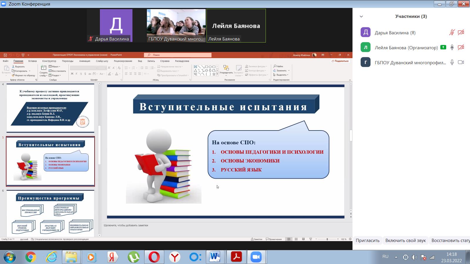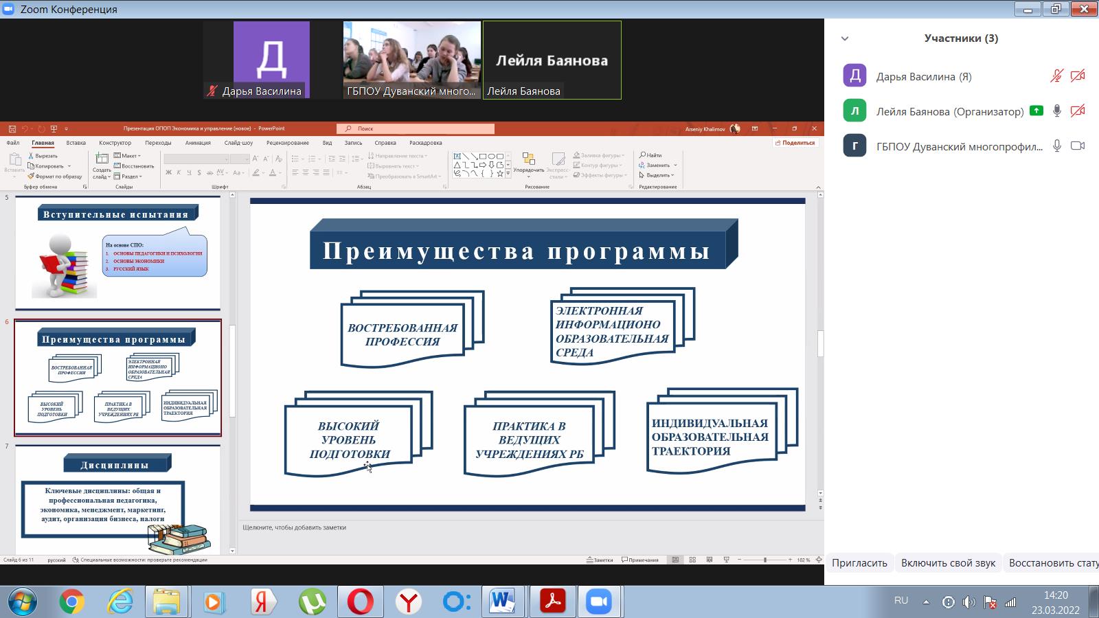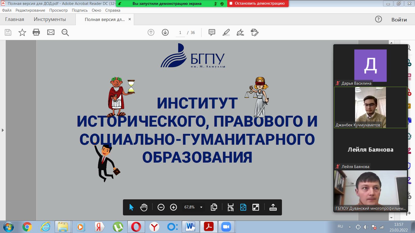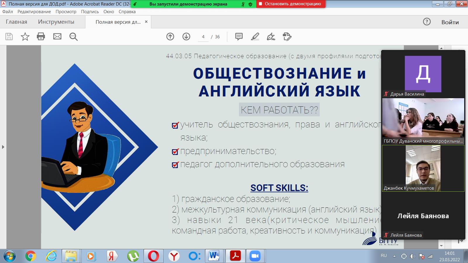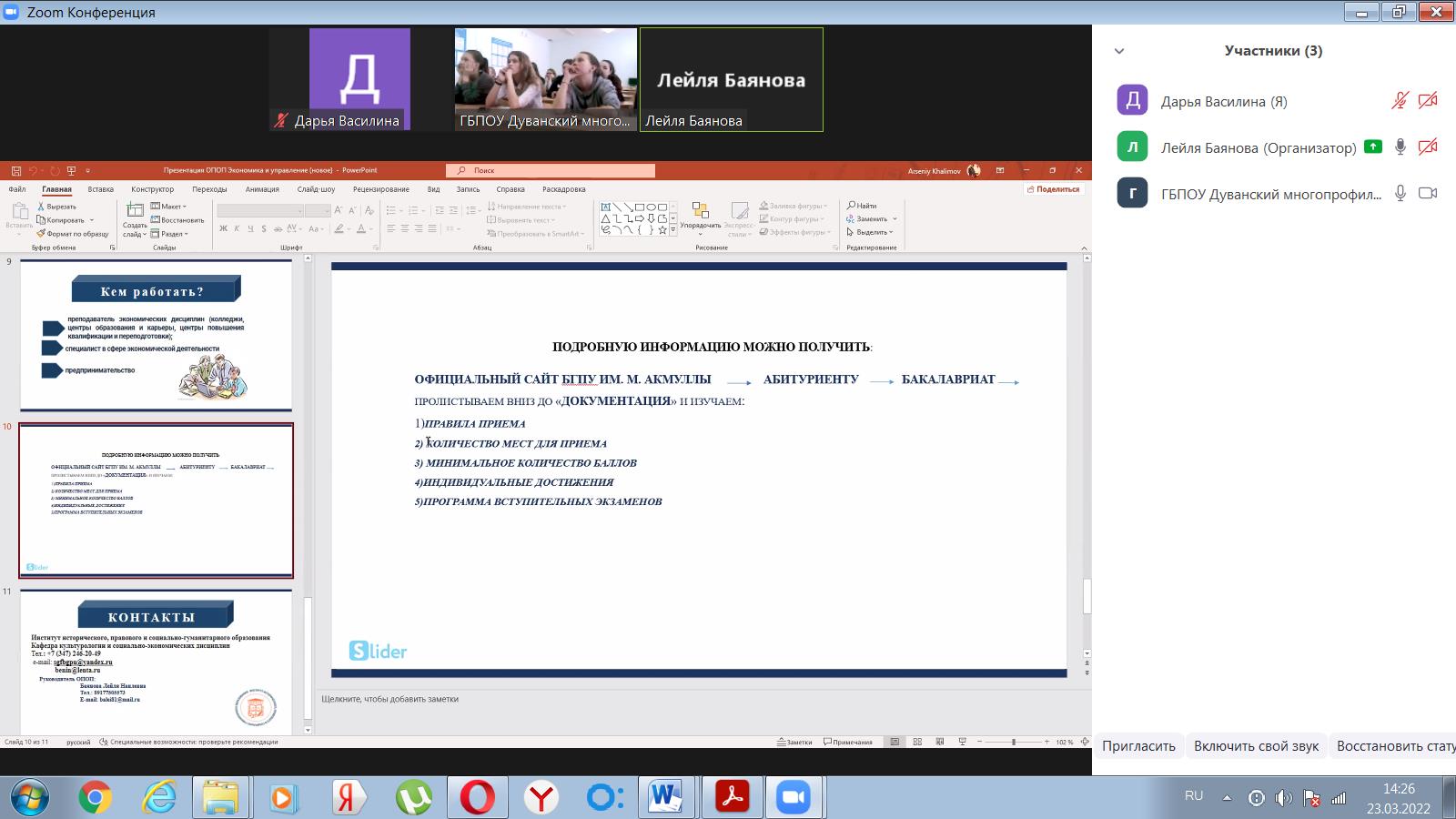 23 марта 2022 года состоялась профориентационная онлайн-встреча представителей Акмуллинского университета с выпускниками Дуванского многопрофильного колледжа. Организаторами встречи от университета стали преподаватели (Юнир Рифович Лутфуллин, Лейля Наилевна Баянова, Дарья Сергеевна Василина) и студент Джанбек Кучмухаметов.