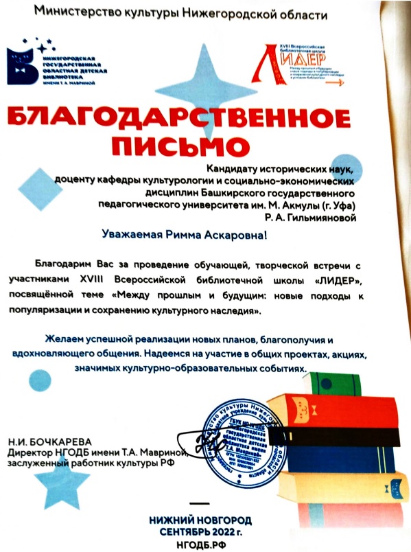 По приглашению Нижегородской областной детской библиотеки доцент кафедры культурологии и социально- экономических дисциплин Р. А. Гильмиянова приняла участие в XVIII Всероссийской библиотечной школе  "Лидер", посвященной теме " Между прошлым и будущим: новые подходы к популяризации и сохранению культурного наследия ". В рамках школы она выступила с лекцией " Книга как инструмент формирования культурной идентичности".