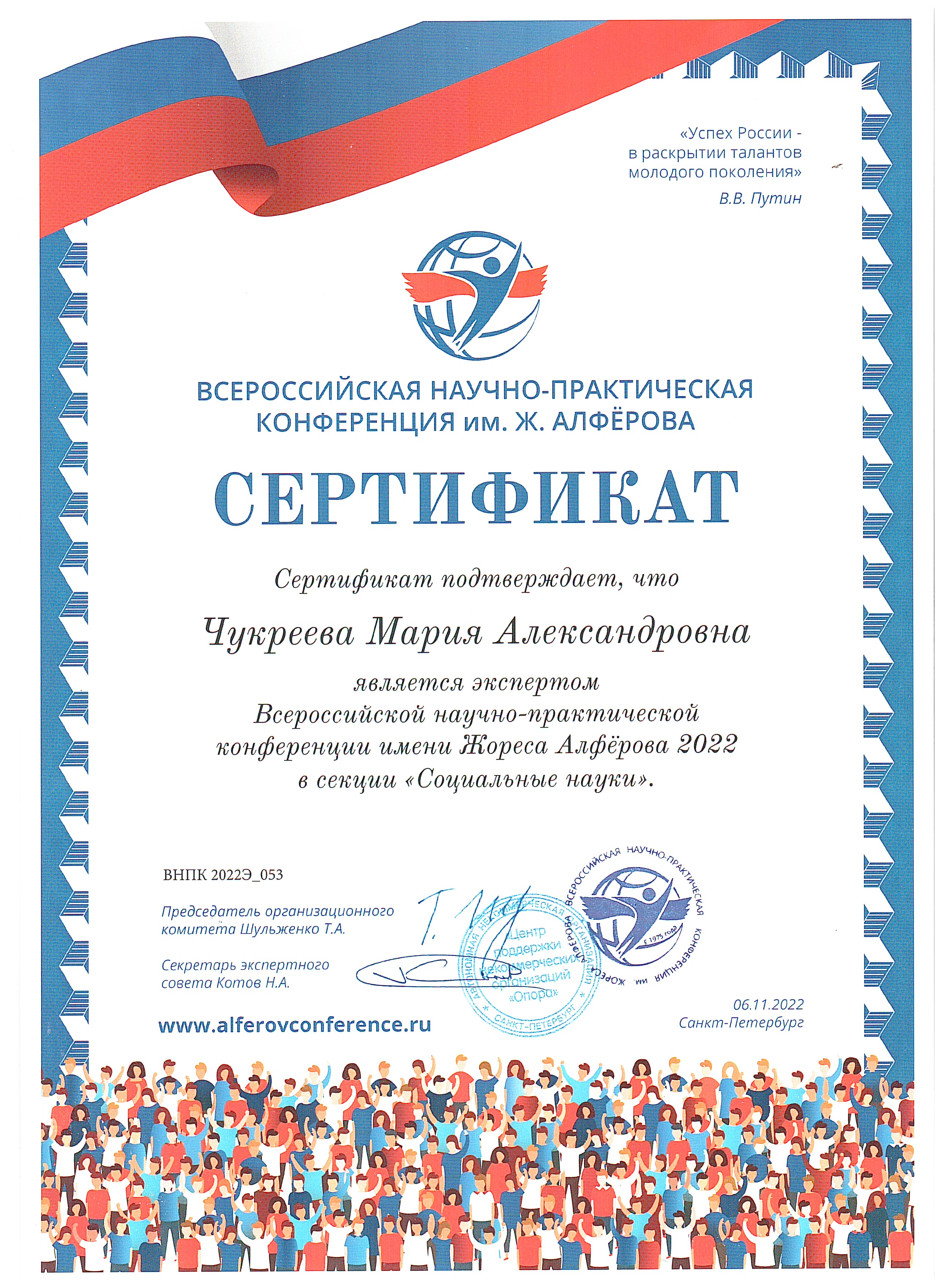 С 4 по 6 ноября старший преподаватель кафедры культурологии и социально-экономических дисциплин М.А. Чукреева работала в составе секции «Социальные и общественные науки» Всероссийской научно-практической конференции имени Жореса Алфёрова в Санкт-Петербурге. Она успешно справилась с оценкой выступлений 18 участников секции, задавала вопросы, активно обсуждала доклады с экспертами секции. Награждена благодарственным письмом и сертификатом эксперта.